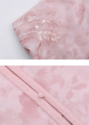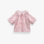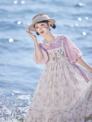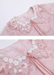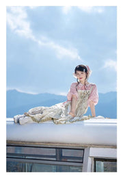 Pair this stunning sundress with our light pink, Ming-inspired round collar shirt. With adorable short puff sleeves and a whimsical Peter Pan collar, enhanced by intricate white floral embroidery. Floral drawstring ties, finished with charming flower beads, add a sweet, feminine touch.