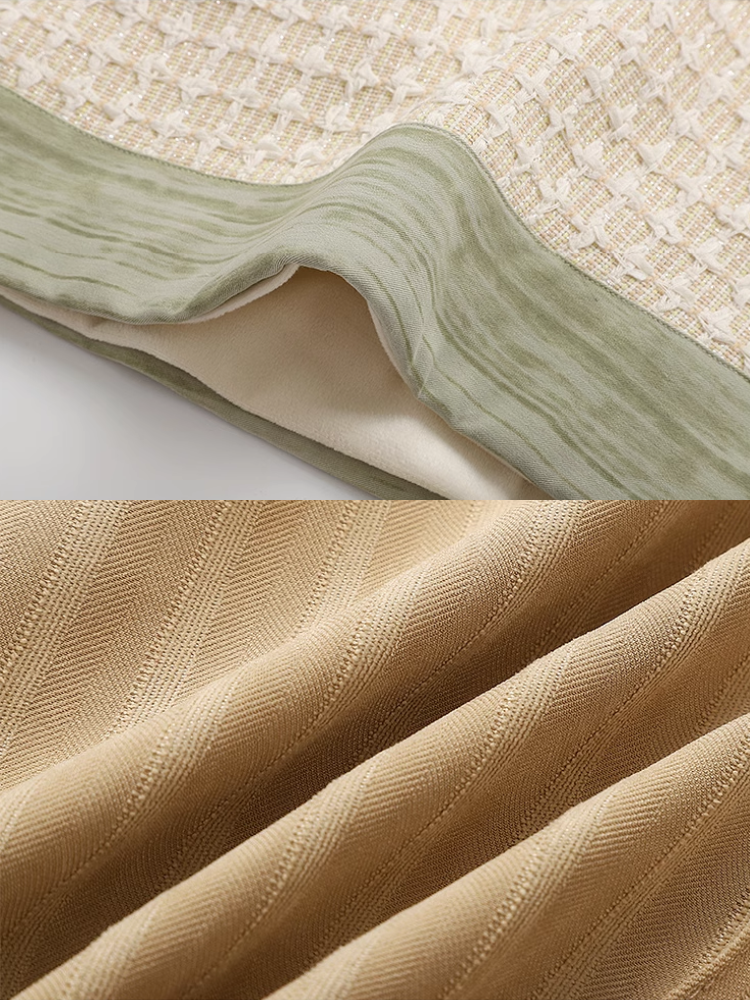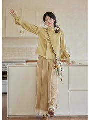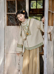 This autumnal set draws inspiration from the Tang and Song dynasties, merging historical elements with contemporary comfort. The standout piece of the set is a jacket that takes cues from the traditional Yuanlingpao 圆领袍 (round-neck robe), reimagined in a modern green & beige plaid. Made from three-dimensional woven fabric, ensuring warmth and comfort.