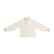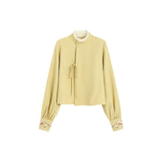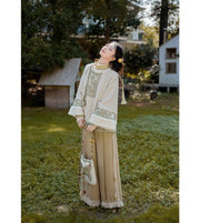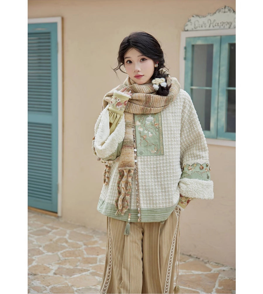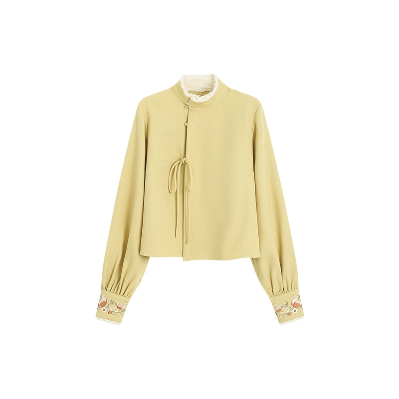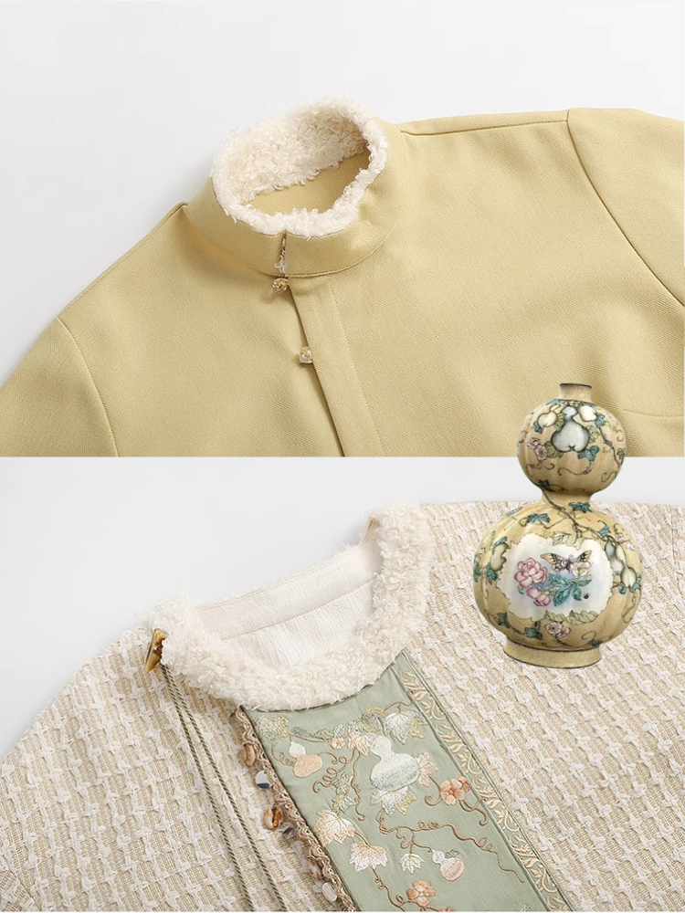 The inner raised collar tops comprises of a soft, yellow or vanilla twill fabric. Traditional stand-up round collar with a diagonal placket, ensuring a secure hold. The cuffs and collar are also lined with imitation lamb wool and embroidered with peach and bergamot motifs, wishing wearers peace and happiness.