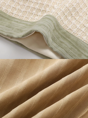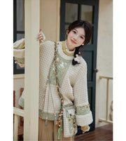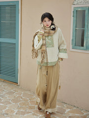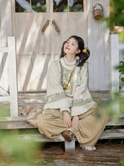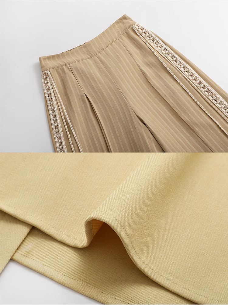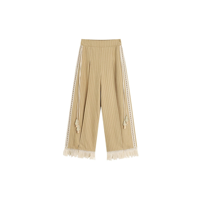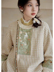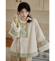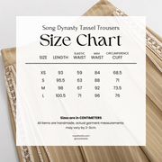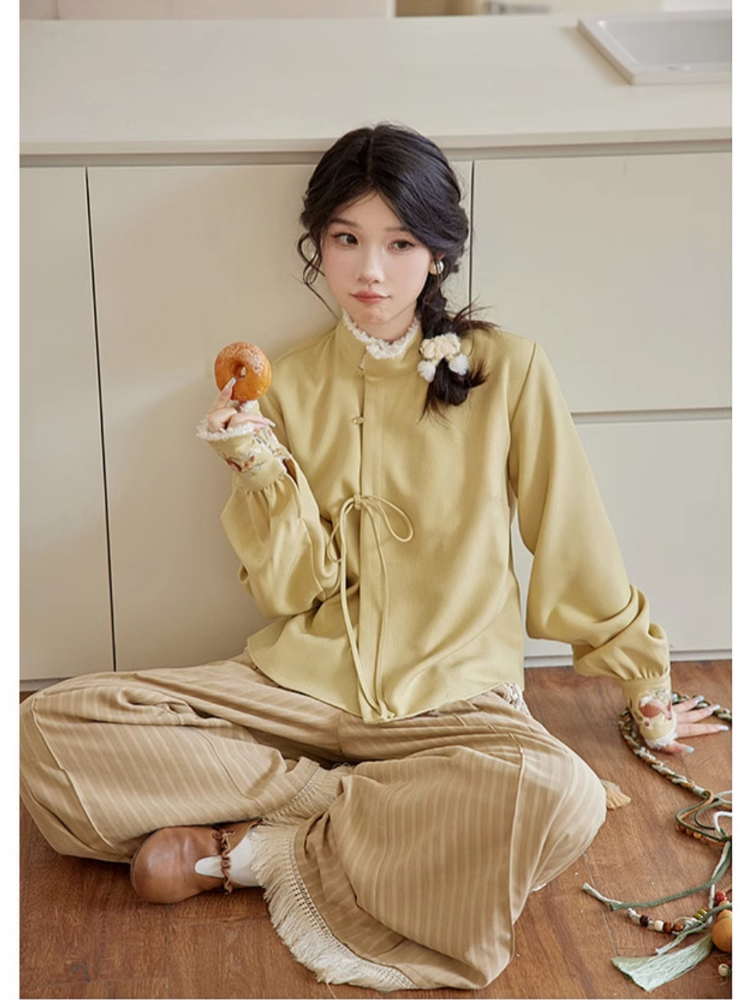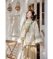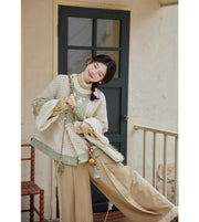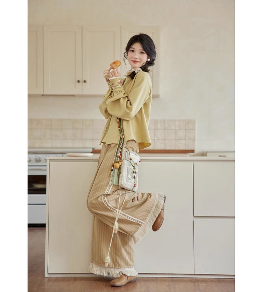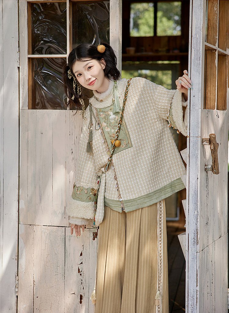 The set is completed with modified Song Dynasty-style trousers in a khaki vertical-striped fabric. These trousers feature meticulously folded pleats at the front and sides, beige webbing with decorative tassels along the sides, and tassels at the hem for added elegance. The pants are also lined with velvet for extra warmth, and practical pockets provide modern functionality.