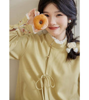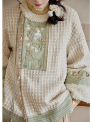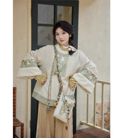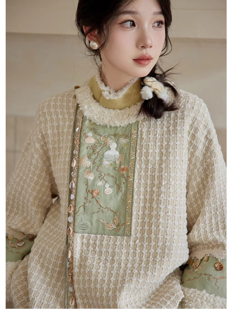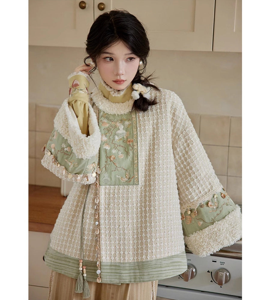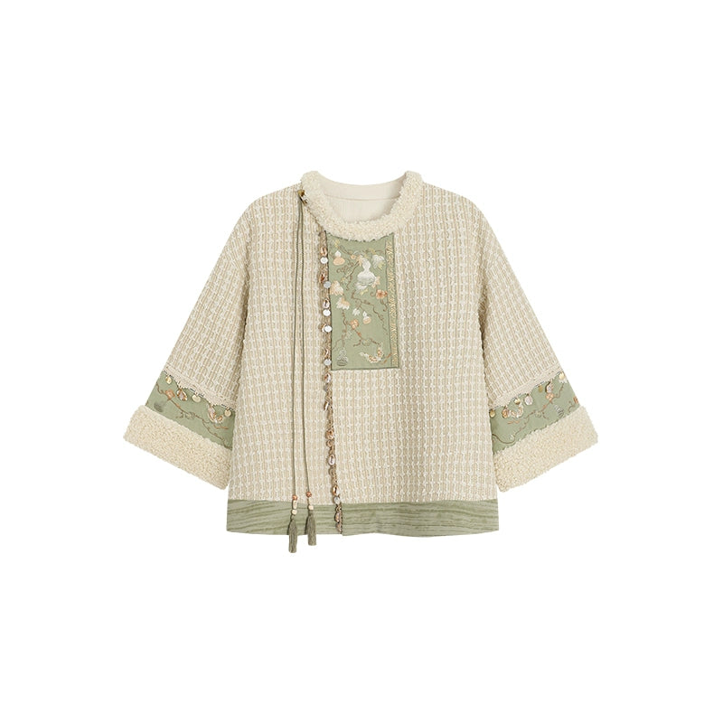 The placket, hem, and cuffs are accented with green fabric, intricately embroidered with motifs of gourds, vines, butterflies, and bergamot peach, symbolizing prosperity and joy. Natural shell bead embellishments along the placket and cuffs inject a touch of playful charm, while the horn-style toggle closures feature decorative tassel tape for a whimsical touch