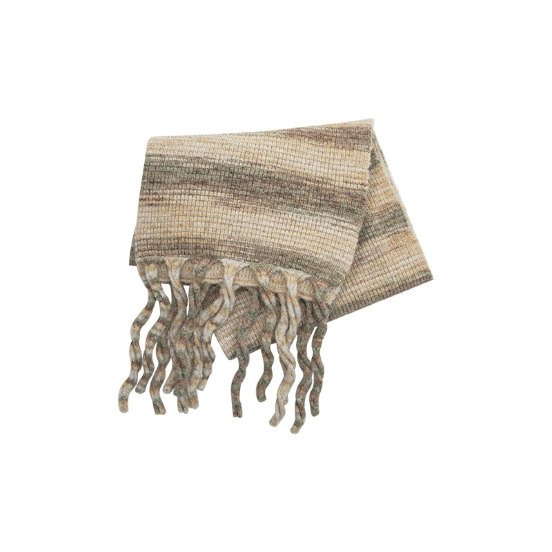 A woven scarf, matching the jacket's palette with warm tones of green, yellow, and brown, completes the ensemble. Horizontal stripes and tassels at the ends make it a cozy, stylish addition.