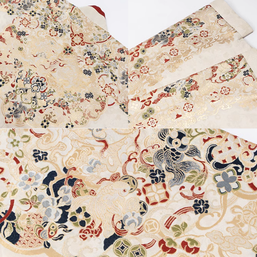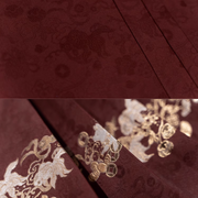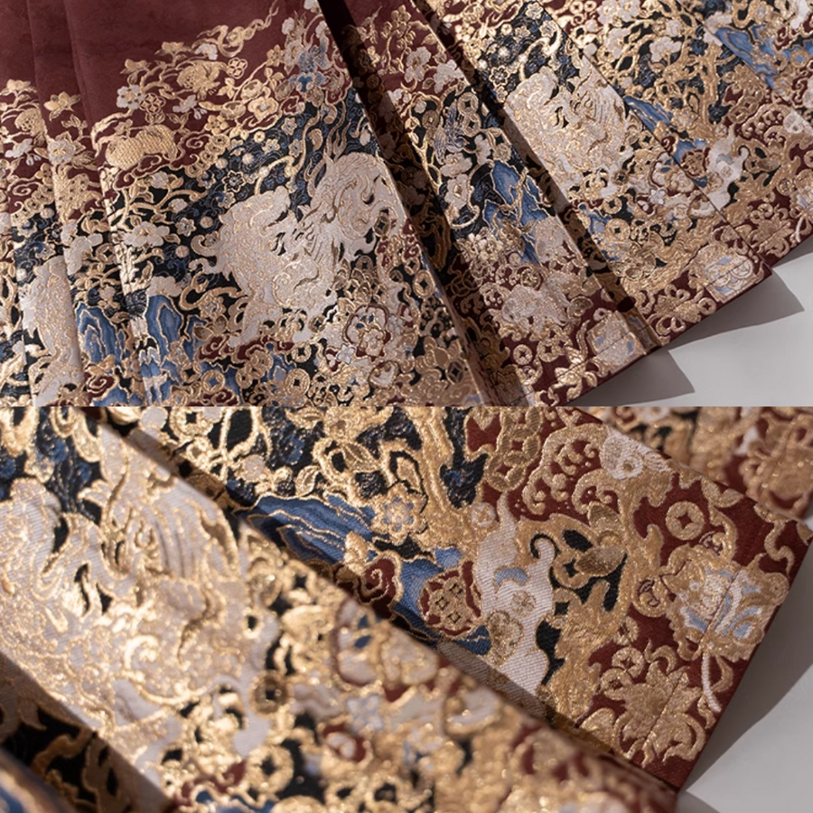 Pair the top with its equally stunning Mamian Qun 马面裙 (horse face skirt) counterpart. Golden threads shine with every step, telling the story of a unicorn running through lively seas. Constructed with trapezoidal side pleats creat a delicately flared A-line shape, while the large front & back panel show off the radiant skirt designs.