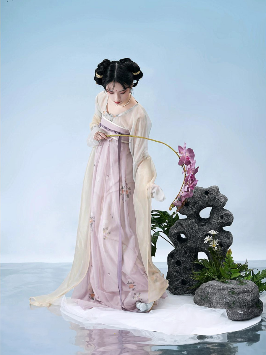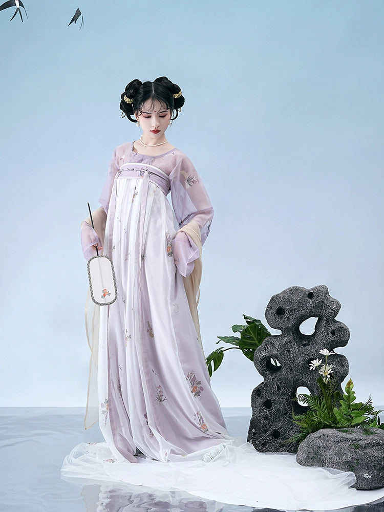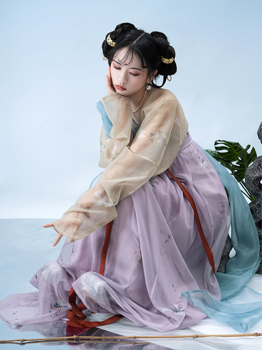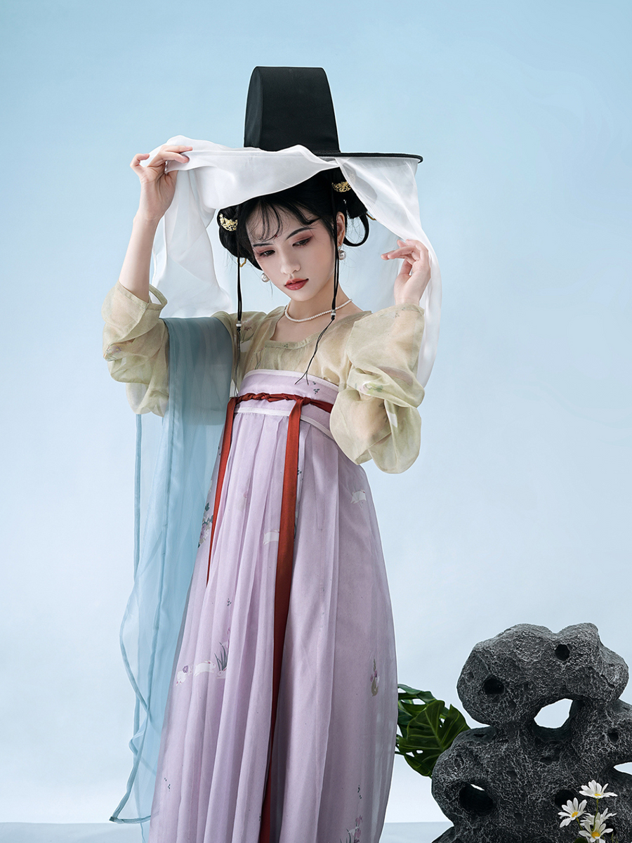 Featuring skinny sleeves and a round collar, this set is more in line with the silhouette of Early Tang and Sui references.