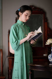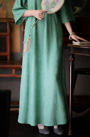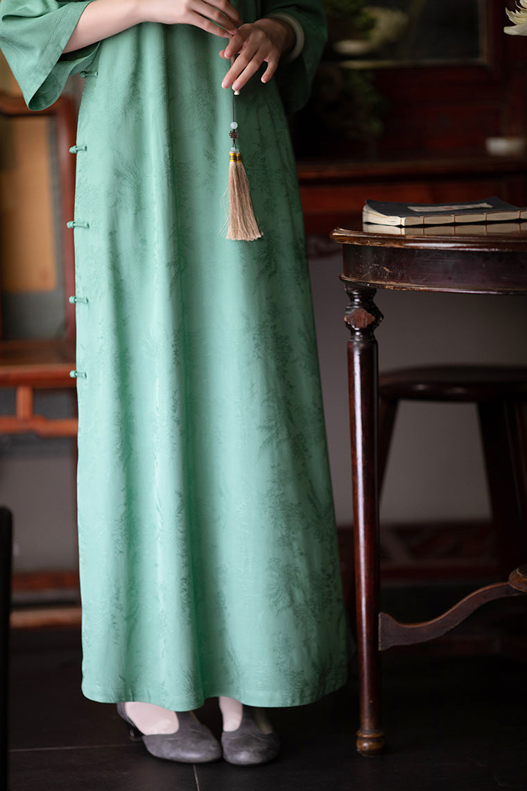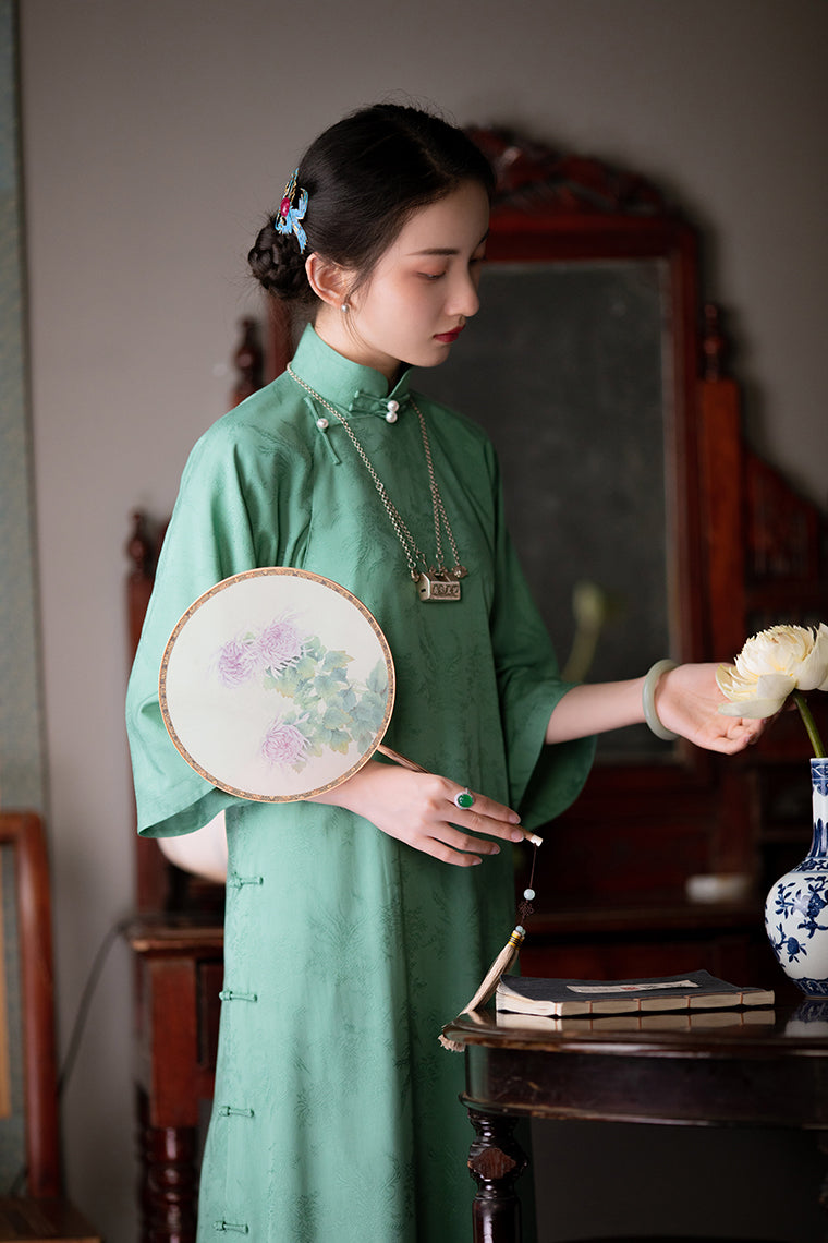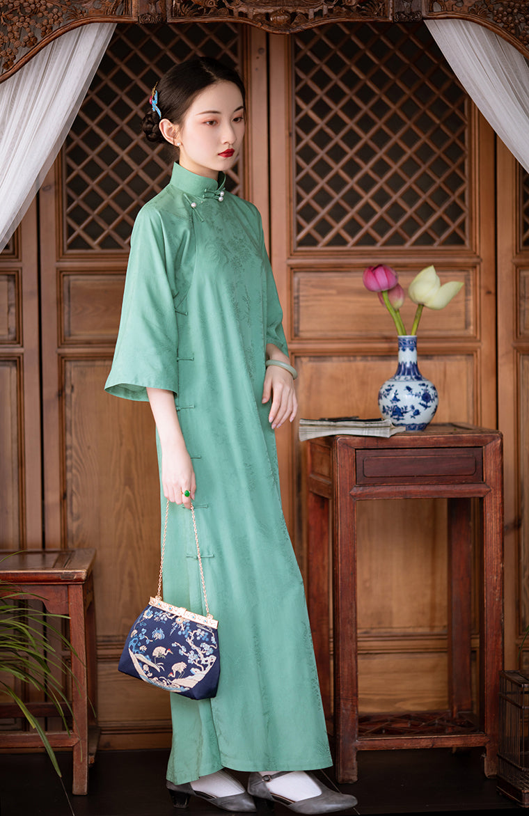 Made in the style of early Republic of China dresses, this style of qipao is much looser, with lower side slits and a lower hem. Large bell sleeves add a delicate touch and a great option for hot and cold weather.