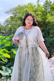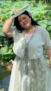 Made from a light linen blend fabric, this is the perfect modernized Tang Dynasty set for warmer days. Features multiple classic garments reimagined for today's fashion-forward goddess: