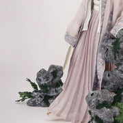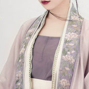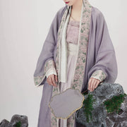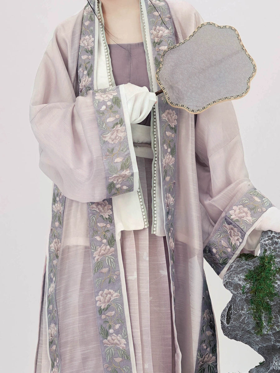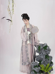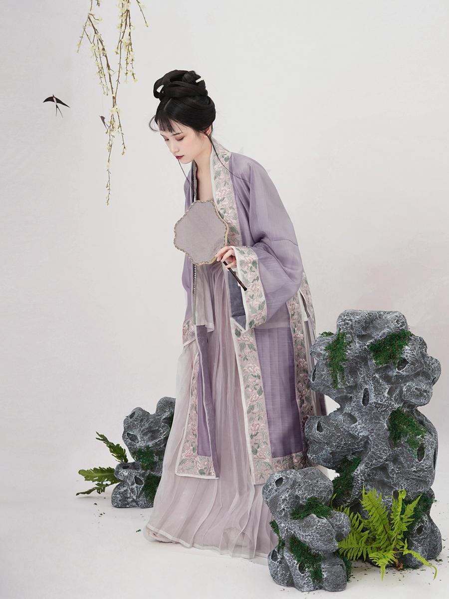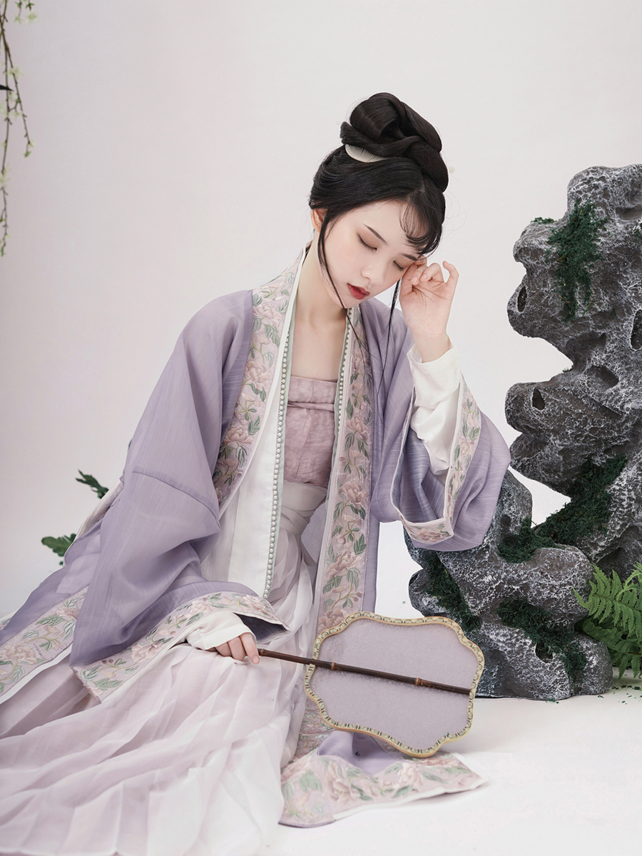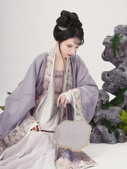 Transform into a spring fairy with this gorgeously detailed lilac floral set with pearl accents! This Song Dynasty set is wonderfully ethereal and light with many layers for you to mix and match as you please.