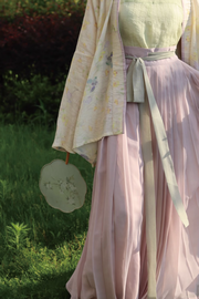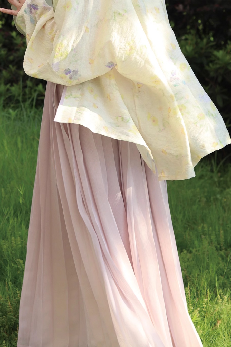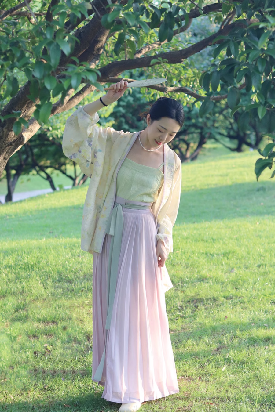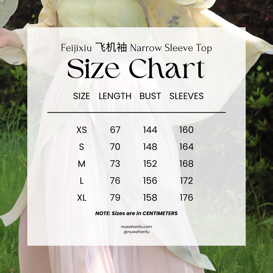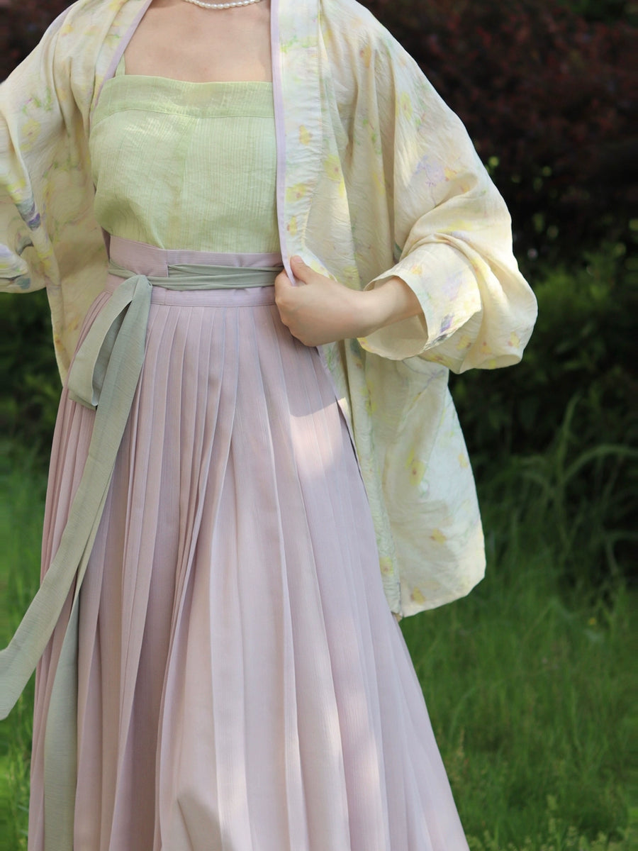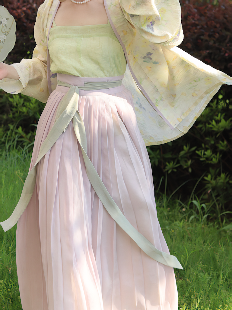 Completing the set is the Feijixiu 飞机袖 (airplane sleeve top), featuring a delicate pastel floral print. Named by modern hanfu fans after its similarity to airplane wings when laid flat, the sleeves have a wider base and slim wrist cuff. These gentle sleeves and soft fabric create a romantic and flattering look, perfect for layering over the moxiong tank or pairing with modern pieces.