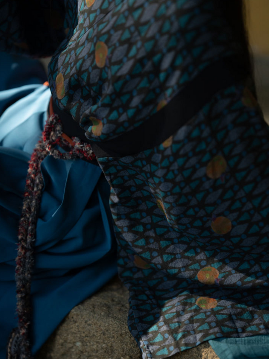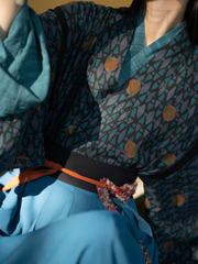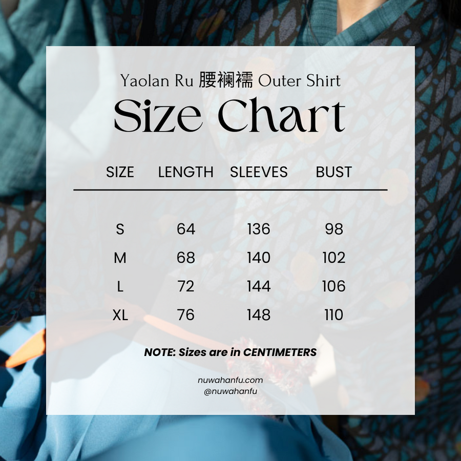 With an autumnal muted color palette, the geometric leaf pattern upon the outer Yaolan Ru 腰襕襦 "wide waist shirt" truly shines, featuring the iconic stripes along the shoulder seams, a popular trend from the Wei Jin Dynasties.