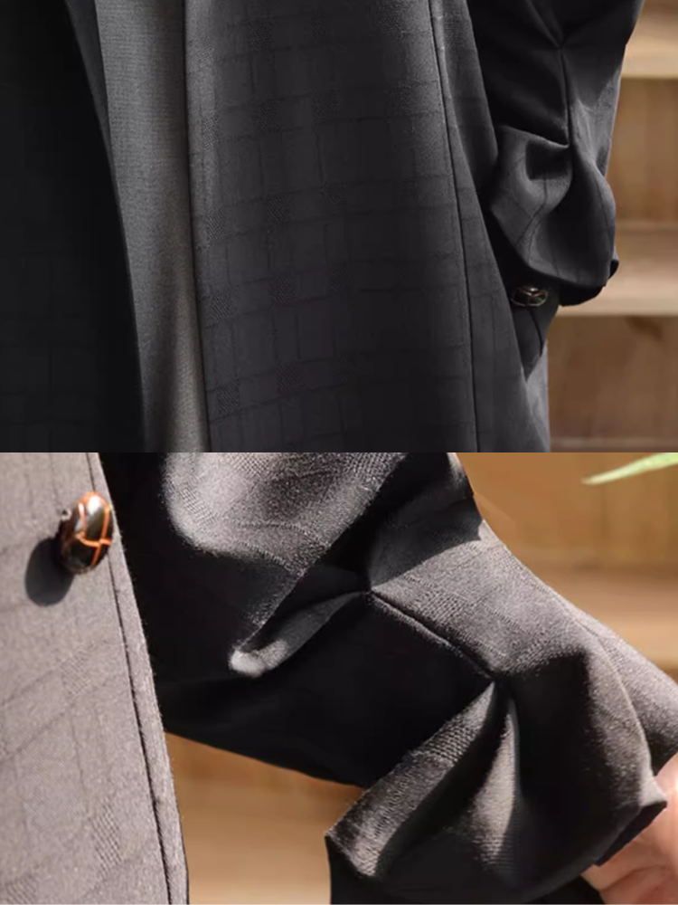 Features a unique wide, slit-back collar that can be folded down, maintaining the timeless wide-sleeved silhouette while adding a modern twist. Made from a soft woolen style fabric with small plaid pattern. Soft, comfortable, and slightly elastic for flexibility.
