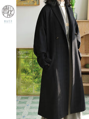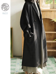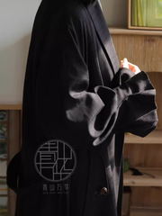 Equipped with a versatile belt, this coat can be styled with loops positioned under the armpits to tie at the waist or elegantly at the back for a decorative touch. The double-breasted design subtly mirrors the layered folds of Zhiju robes, enhancing both structure and visual interest. The front placket allows flexibility, offering the option to wear it open for a relaxed look or buttoned up for sophistication.