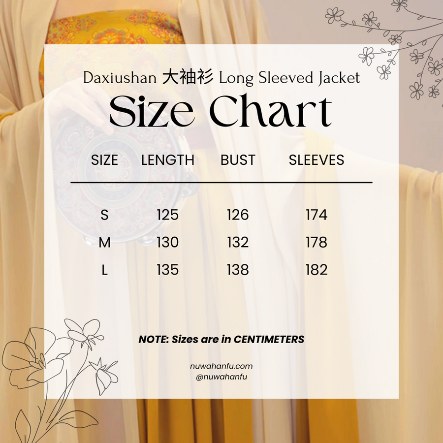 Finish off with the Daxiushan 大袖衫 (long sleeved jacket), made of soft chiffon that will float in the wind. And the matching Pibo 披帛 (shawl) for maximum flowiness.