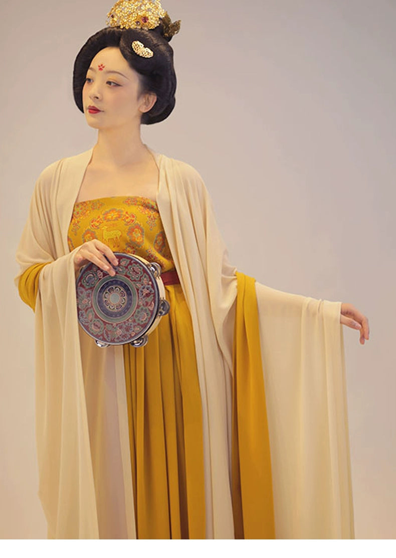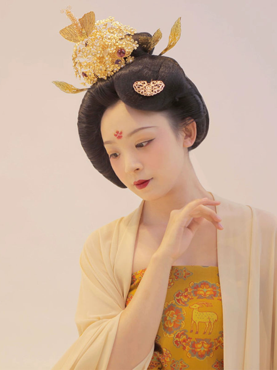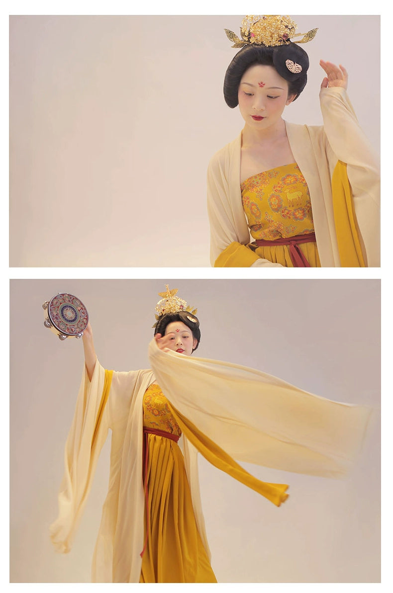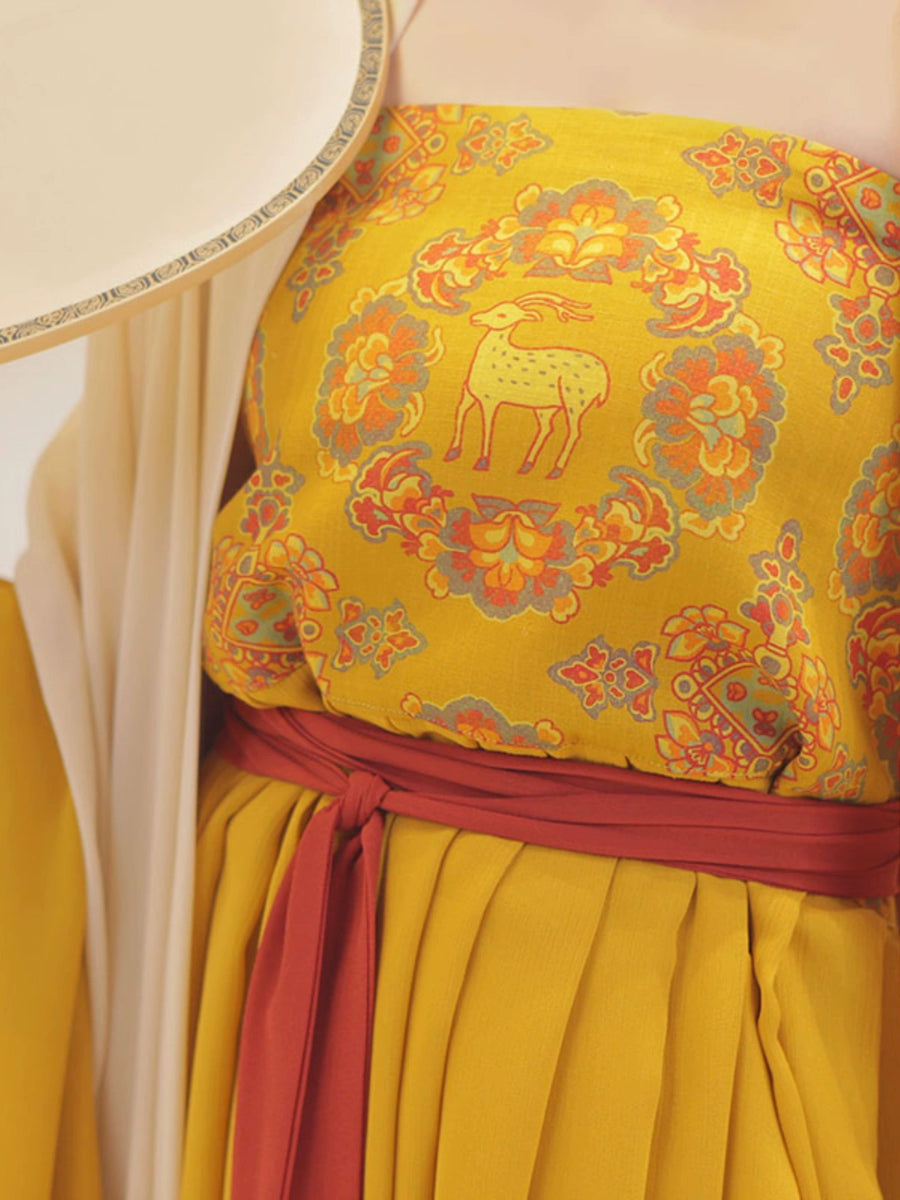 Featuring a coy deer, a symbol of longevity and grace, gently encased in a laurel of bursting flowers. Full of prints and motifs from Tang Dynasty patterns, this Hezi Qun 诃子裙 (Hezi Dress) showcases the ethereal flow of Late Tang Fashion.