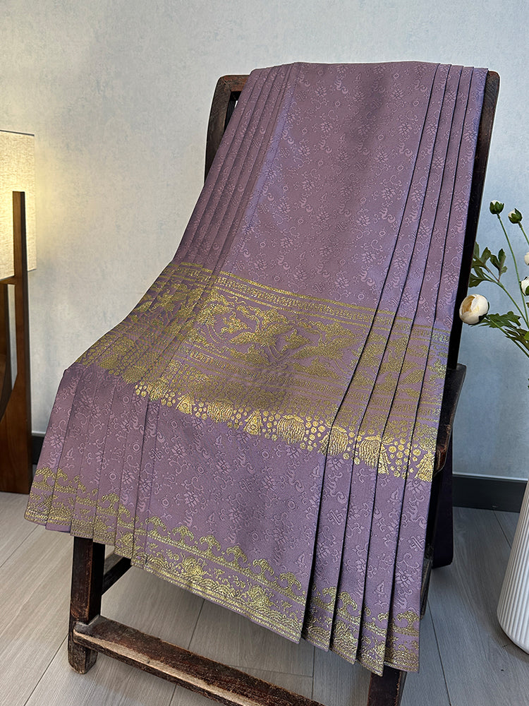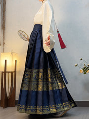 Stunning golden threads run throughout the skirt, adding a touch of luxury to any ensemble. Features a double Lan 襕 (decorative border) design common during the Middle Ming Dynasty. A wider strip at the knees paired with a thinner strip along the bottom, this allows it to be paired with shorter shirts without losing an inch of stunning textiles!