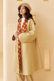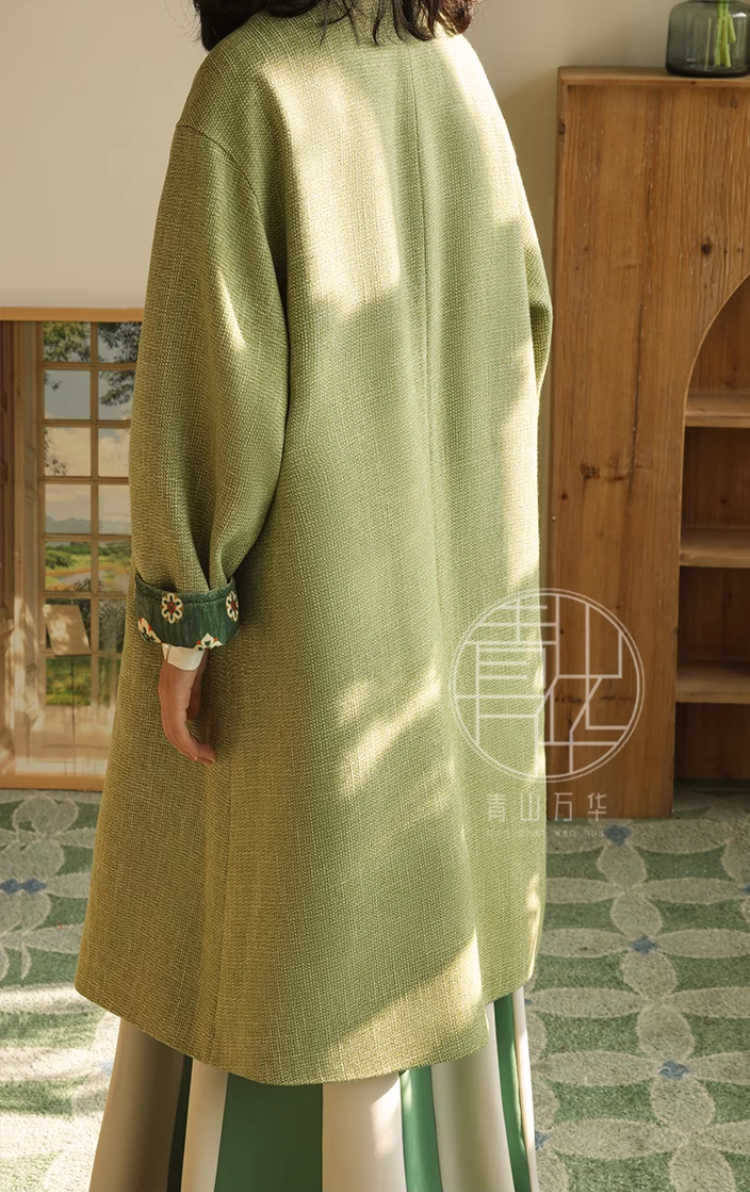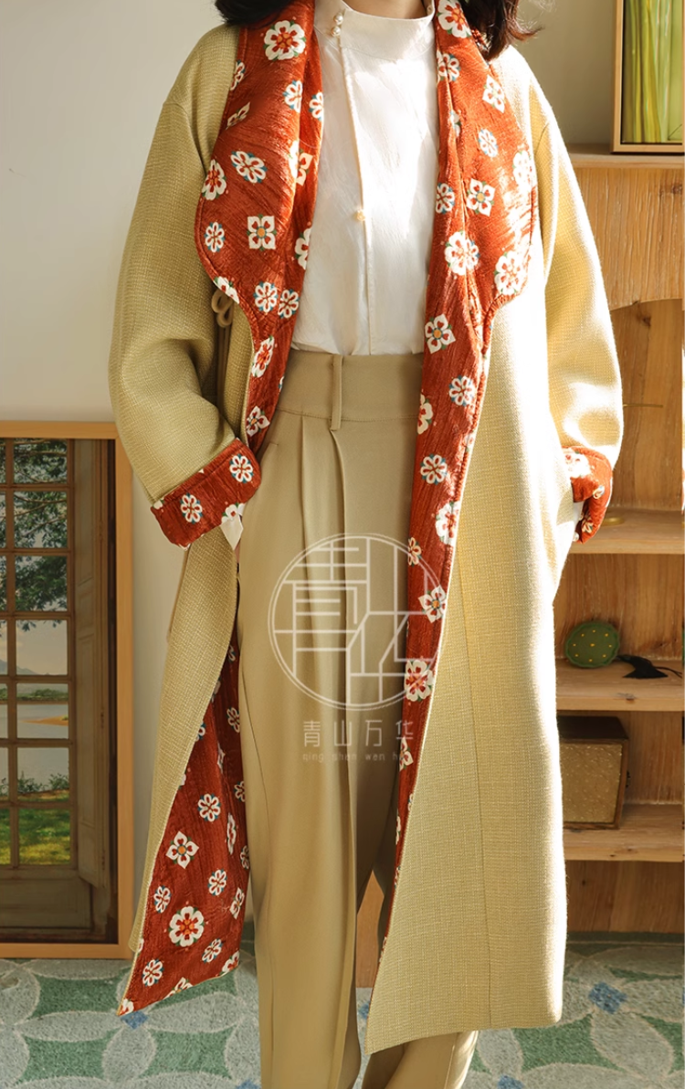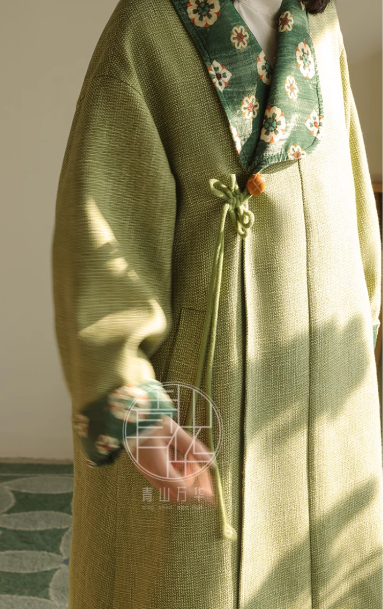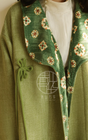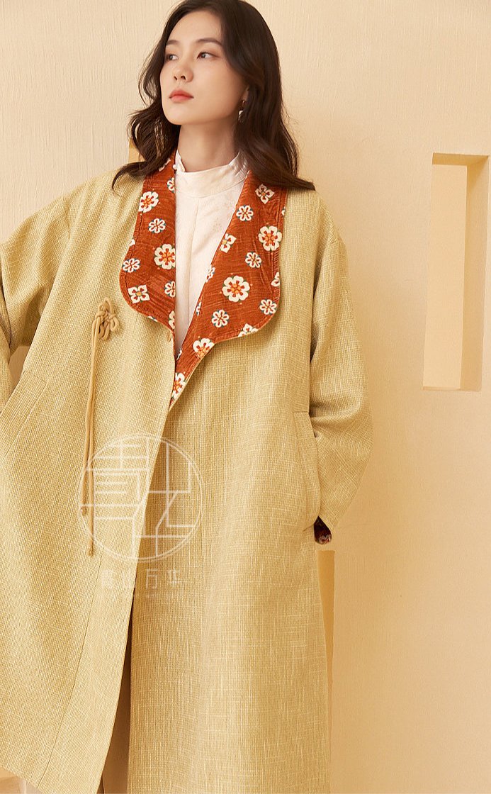 Pockets, Tang Dynasty silhouettes, and traditional flower mandela prints - what's not to love! The Zao Qiu 早秋 Early Autumn Modernized Tang Pi Ao Coat is available in two autumnal colors: bean green with emerald green lining, and bud yellow with red lining.