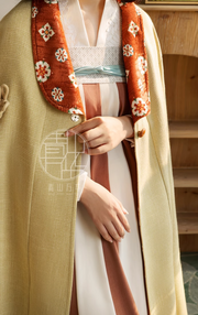 The Tang Dynasty Pi Ao 披袄 (cloak jacket) features rounded wide lapels, and is constructed similarly to a Yuanlingpao 圆领袍 (round collar robe). Worn by men and women, this was a popular horse riding coat!