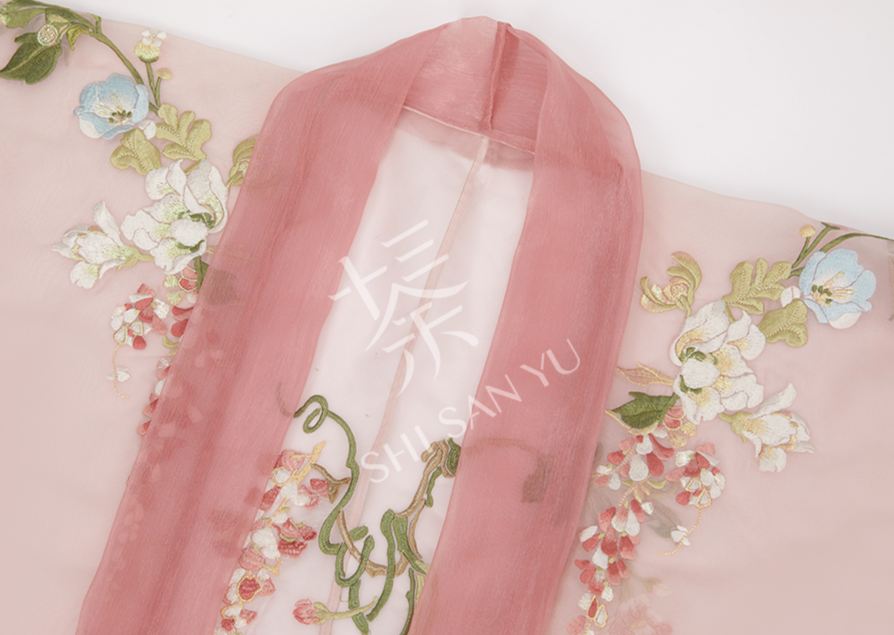 Complete the look with the Daxiushan (大袖衫, long sleeve jacket) which is of course: embroidered with floral trim.