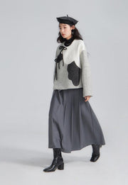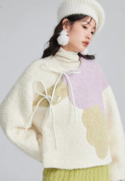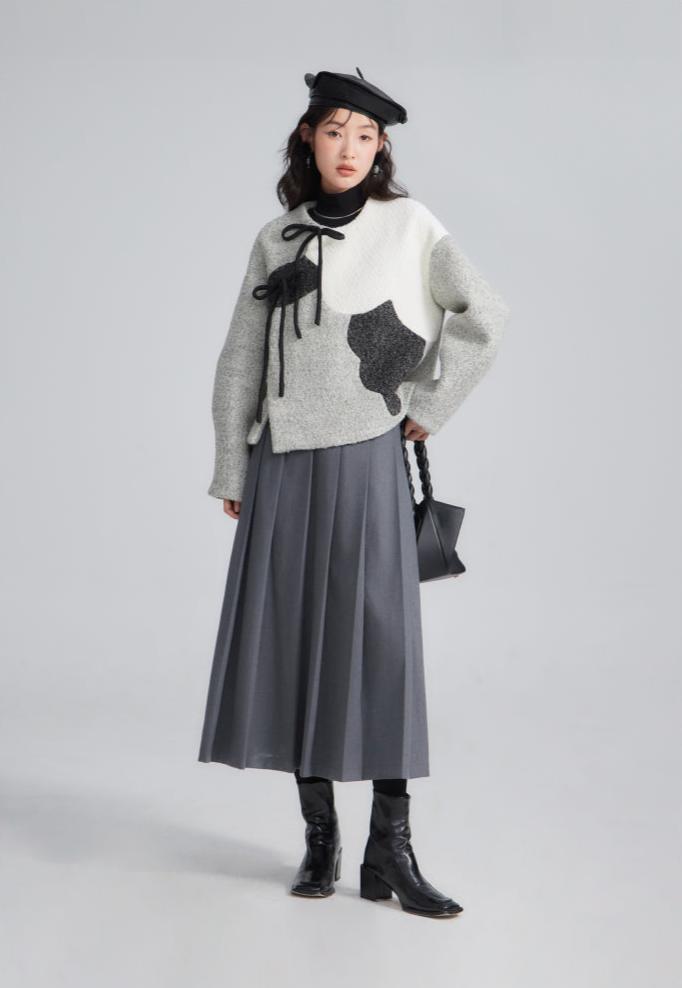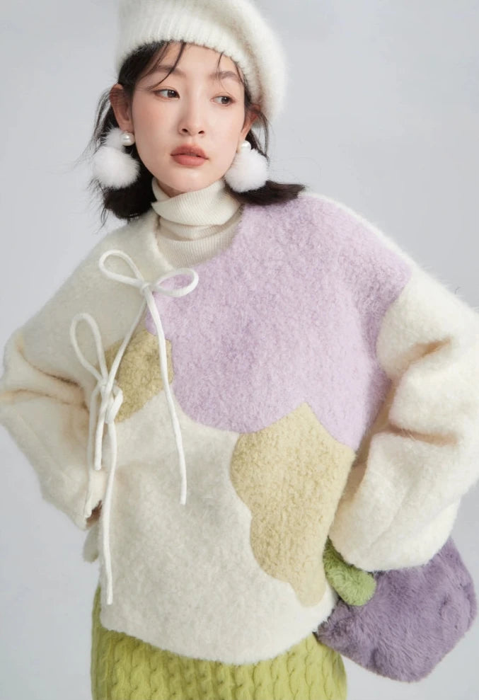 Funky color-blocked peony petals are layered upon a soft woolen teddy coat! Inspired by the collars of Ming garments and diagonal seams of qipao, this cozy jacket is the perfect layering piece for any occasion.