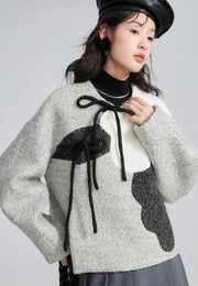 Oversized ribbons secure the jacket while adding a feminine and dramatic flair.