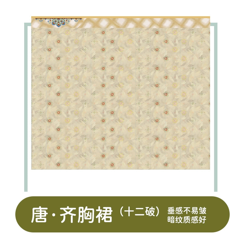 The chest high skirt is a quintessential piece of 7th century fashions and is brought back to life in this patterned Po Qixiong Qun 破齐胸裙 ("broken" chest high skirt). Don't worry, it's not actually broken - it refers to the many strips of fabric sewn together to create a whole skirt.
