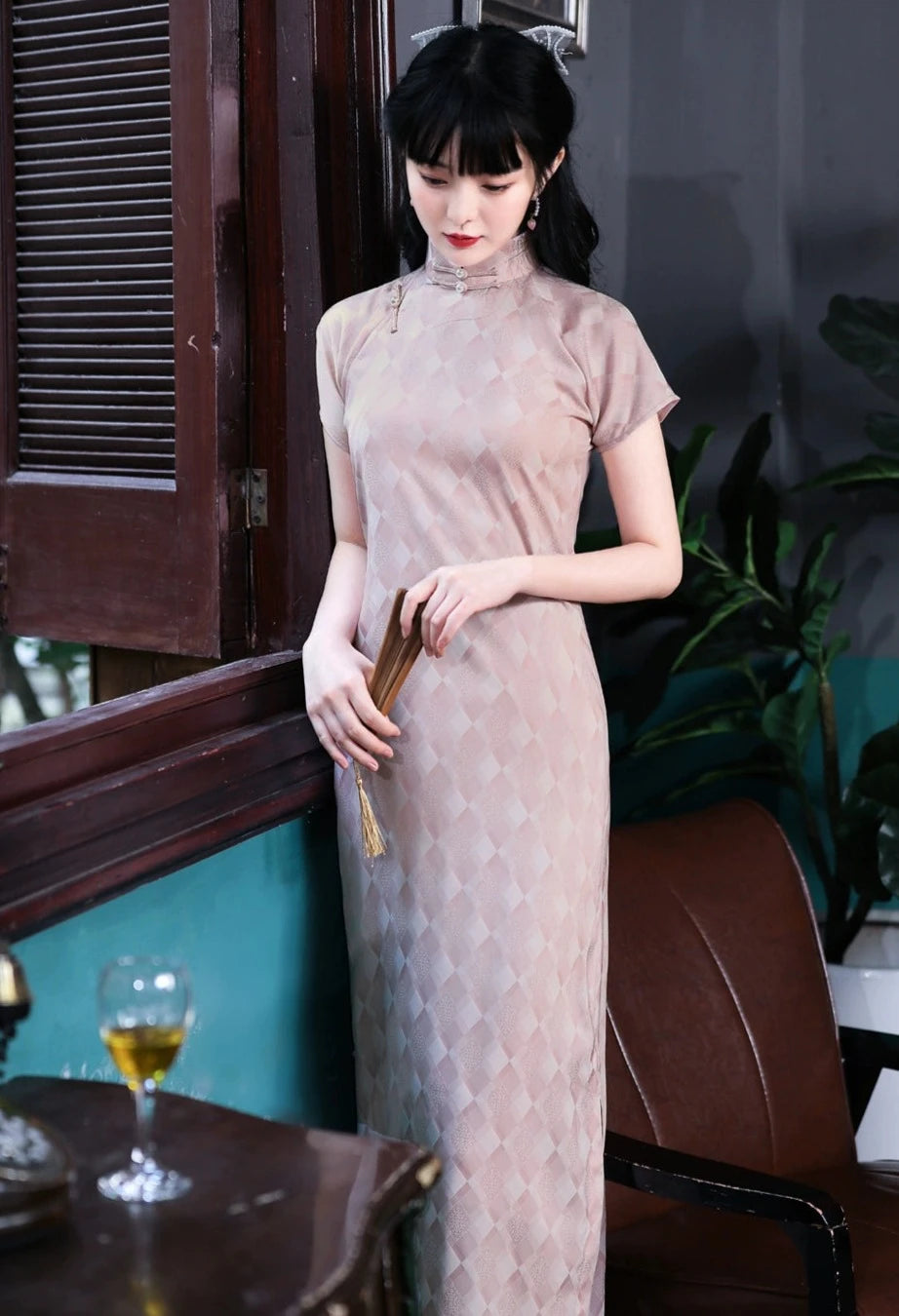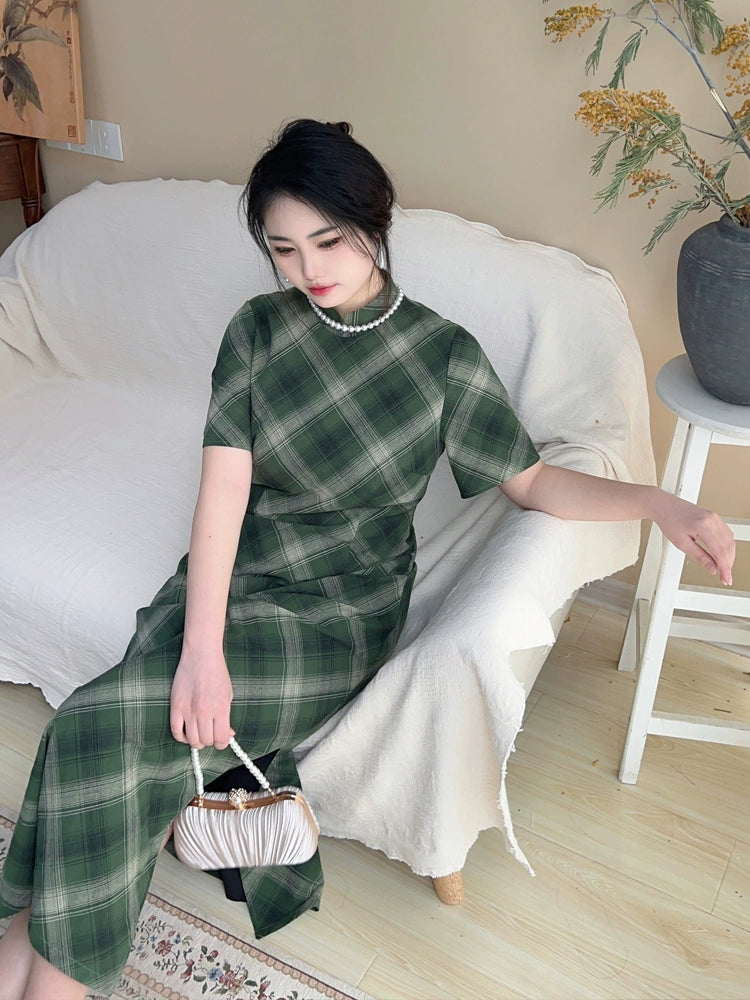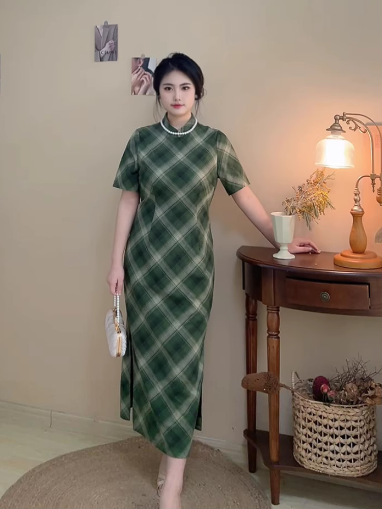Gezi 格子 Plaid Plus Size 1930s Inspired Cotton Short Sleeve Qipao
