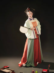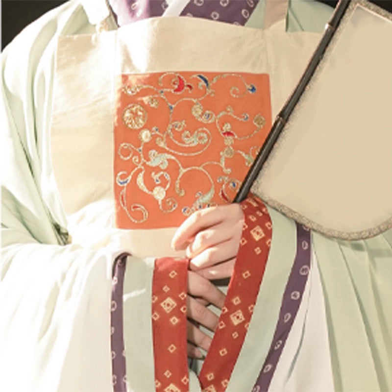 Patterned and layered shirts called Yaolan Ru 腰襕襦 in traditional Chinese jewel tones, highlighting a special trend from the WeiJin where they would add contrasting fabric along the shoulder seams. Common to style tucked into the skirt or over the skirt for a more comfortable look.