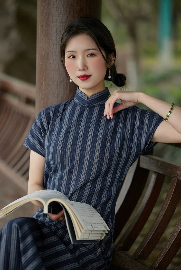 Features navy and light blue stripes that elongate the figure, lower side slits for more coverage, and classic Chinese knot buttons.