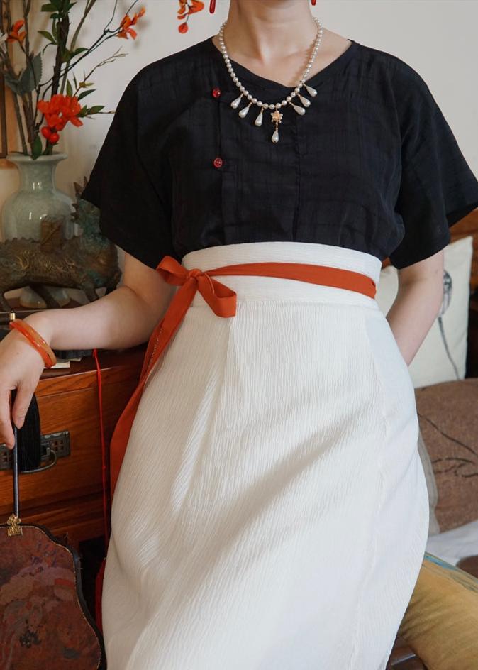 Eight-paneled Poqun 破裙, literally translated as "broken skirts", are shortened to a midi length for better daily wear. These flared skirts are made of many large panels of fabric, sewn together to create one whole skirt (hence the name).