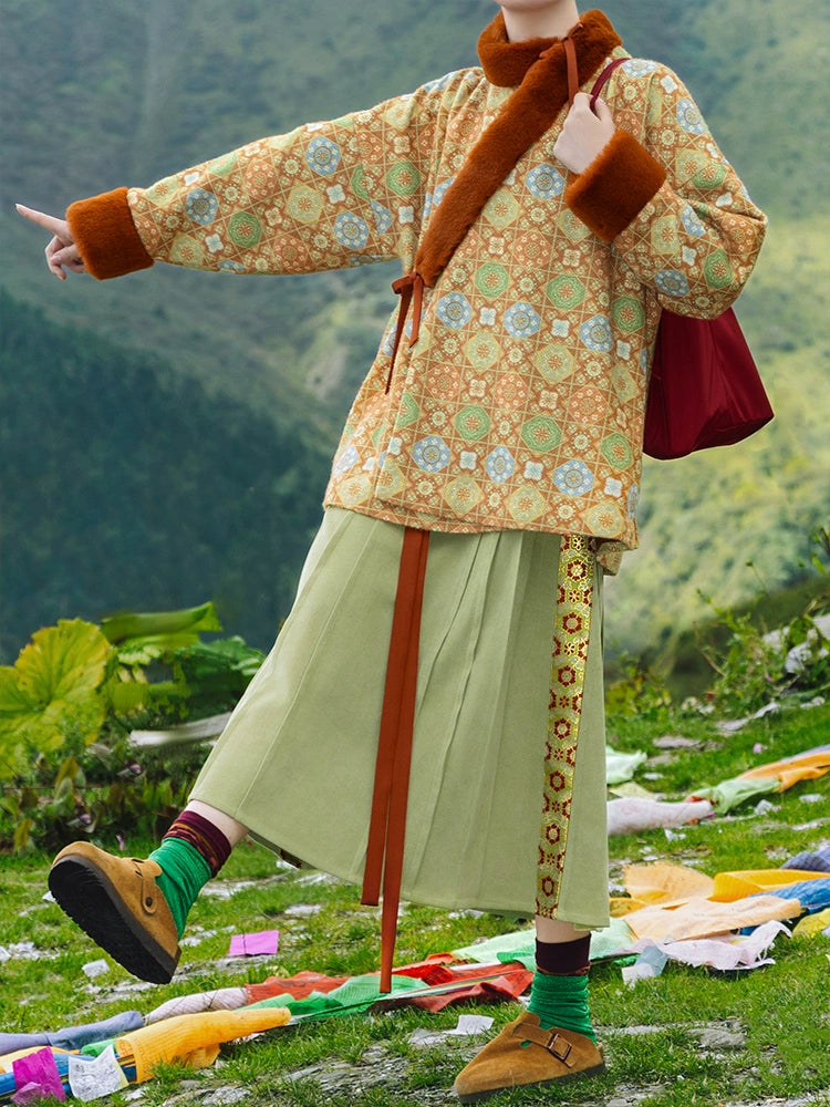 Bai Fu 百福 Hundred Wishes Modern Wei Ming Fur Cross Collar Coat & Velvet Poqun Skirt Set