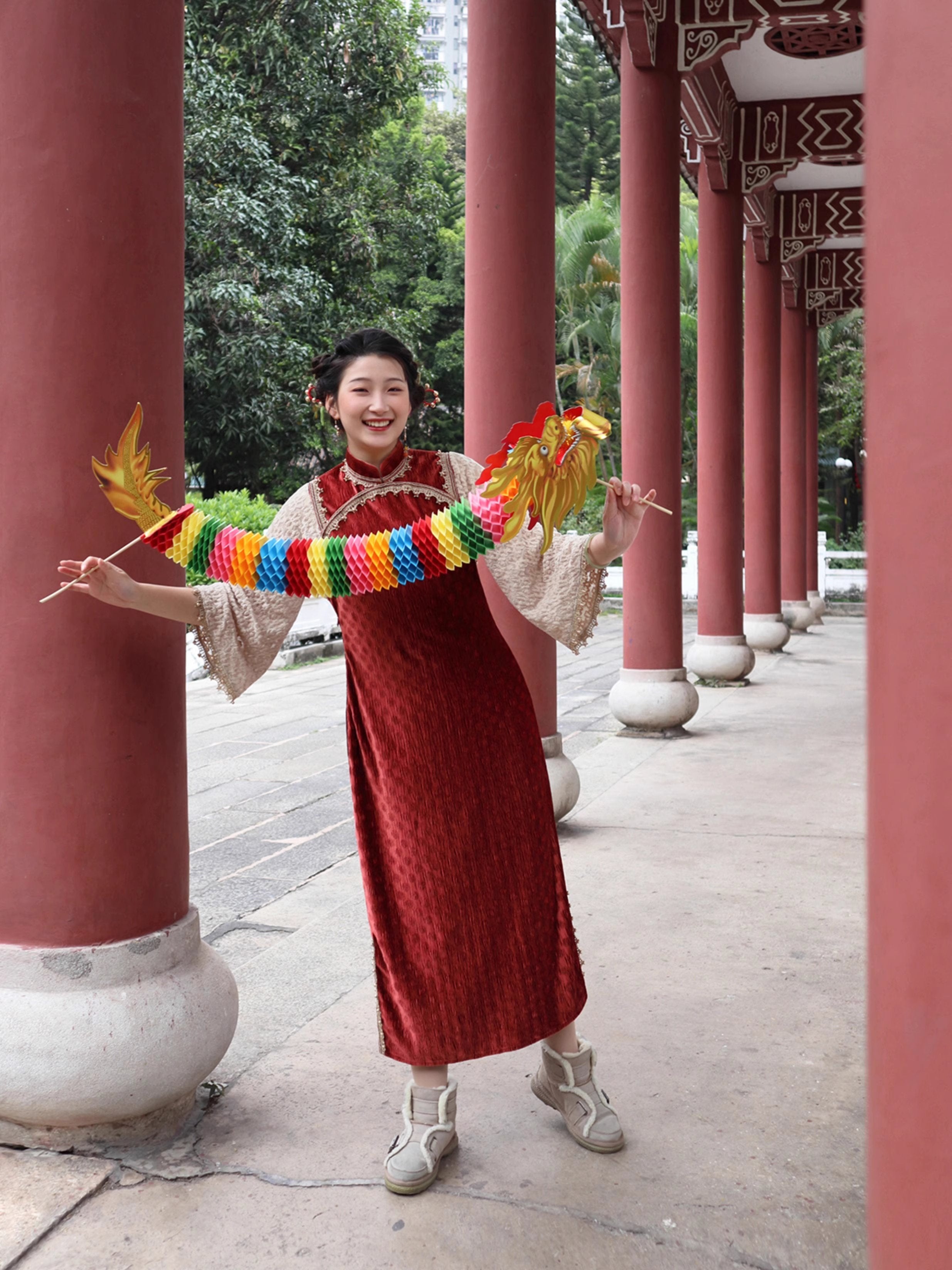 Hong Baobao 红饱饱 Fully Red 1920s Inspired Plus Size Faux Sleeve Fur Trim Winter Qipao
