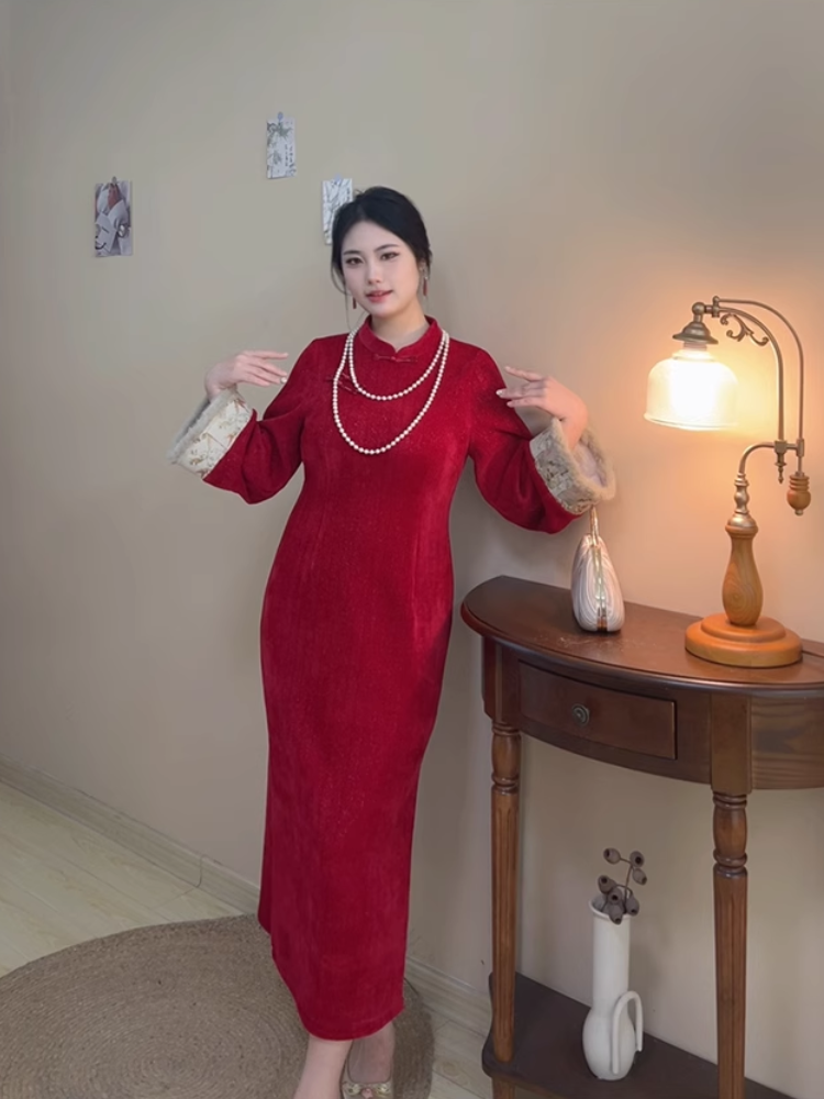 Hong Baobao 红饱饱 Fully Red 1920s Inspired Plus Size Faux Sleeve Fur Trim Winter Qipao
