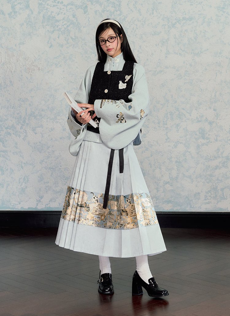 Haiyan 海盐 Sea Salt Modernized Ming Plus Size Knit Standing Collar Top & Easy Wear Mamian Skirt