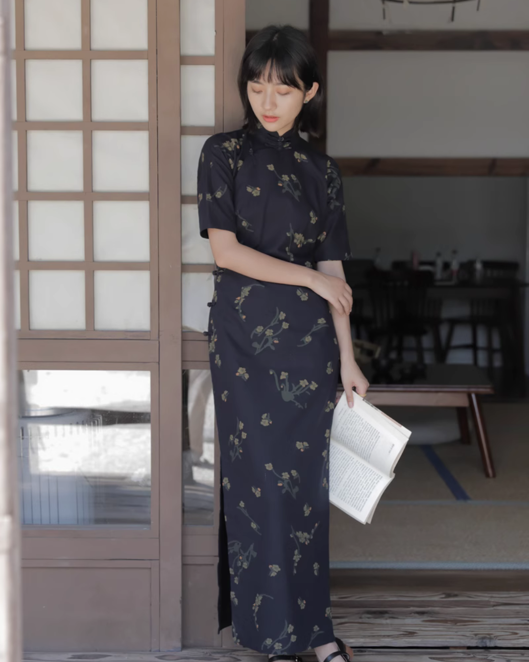 The iconic silhouette of Republican era China qipao features the classic high collar and Chinese knot buttons, but with a comfortable loose waist and modest side slits.