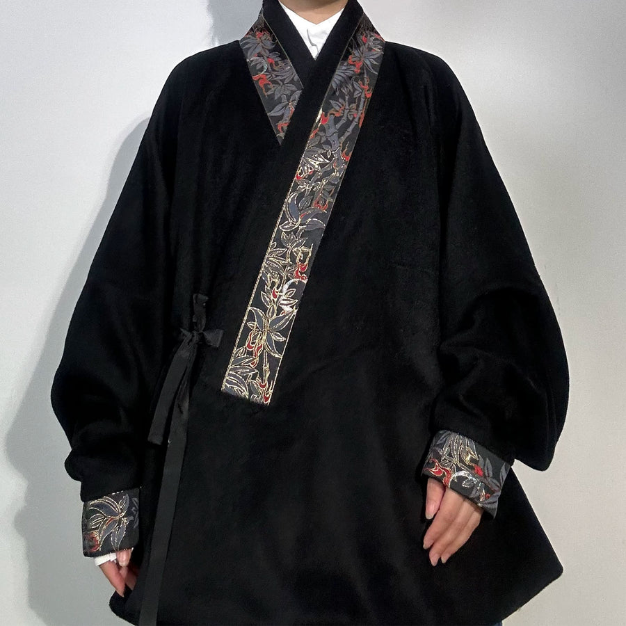 Brocades of traditional winter plants line the collar and cuffs, creating a lovely contrast and drawing the eye to the iconic collar style of hanfu. Based on Jiaoling Ao 交领袄 (cross collared coats), these short jackets have been a staple in Chinese fashion history for centuries.