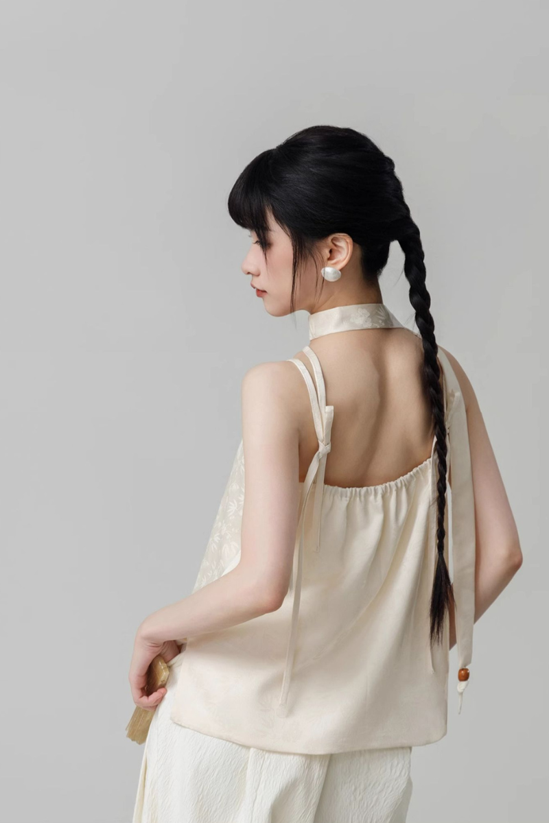 And finally, the perfect base: the soft and silky Tank Top (diaodai, 吊带) with matching wooden bead detailing. A contemporary take on the historical Song Dynasty undergarment, this is a versatile top to be used as a base for other hanfu ensembles, or to be worn as-is.