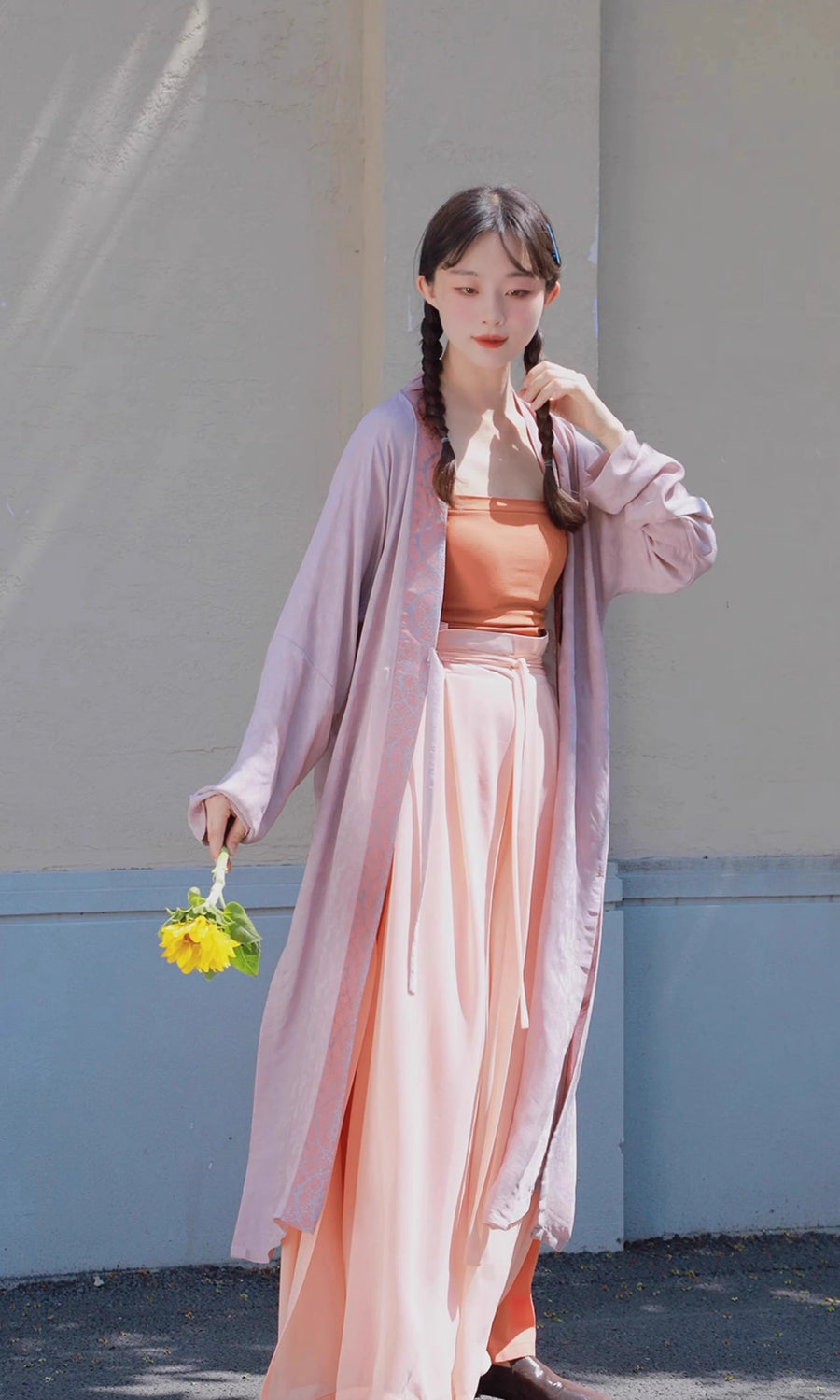 - Outer Pants: The light peach color is both soft and sophisticated, featuring chic side slits that reveal glimpses of the inner layer as you move. This clever design not only adds a dynamic element to your look but also enhances airflow, ensuring you stay cool and comfortable throughout the day.