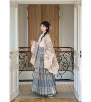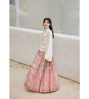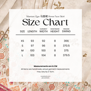 Choose from 3 fun colors for the Mamianqun 马面裙 (horse face skirt), all filled with brocades of prancing deer, blooming flowers, and swirling clouds. Resembles cave grotto style art, adding a unique and ethereal flow as the design wraps around. Shimmering golden threads add extra drama and dimension to this classic skirt.