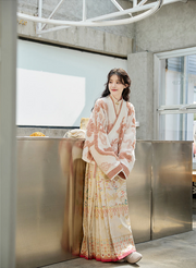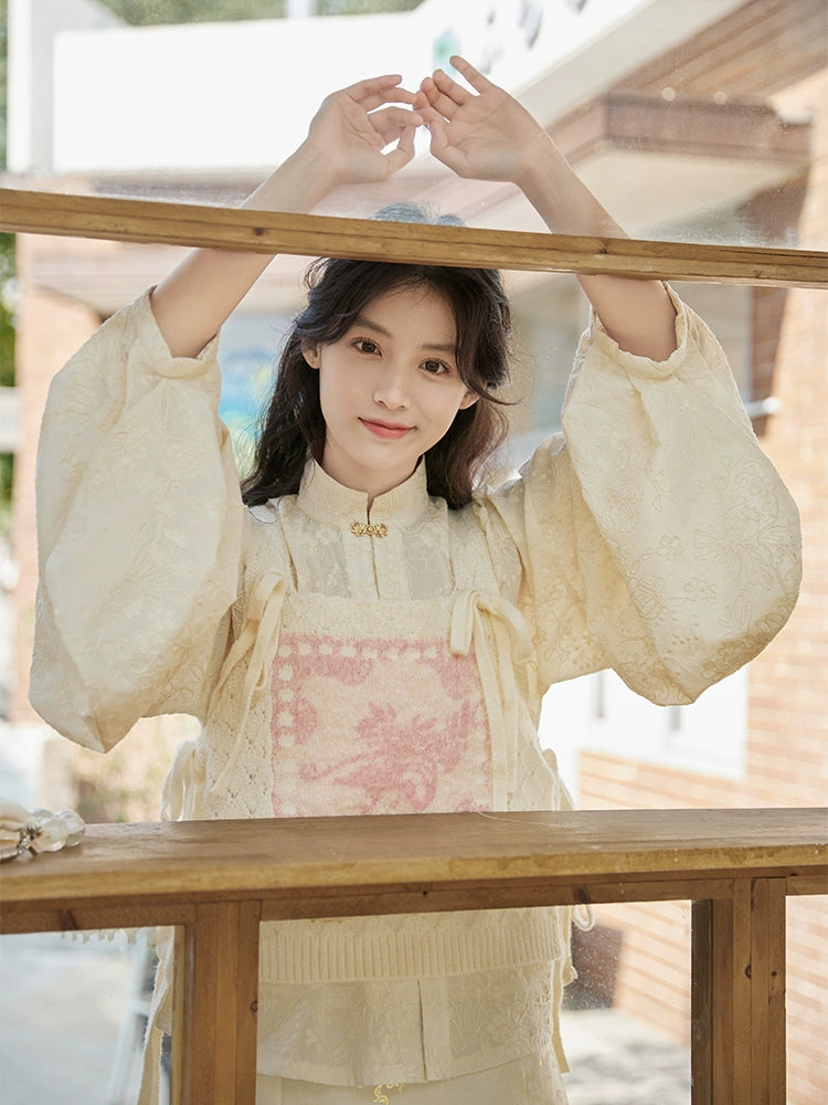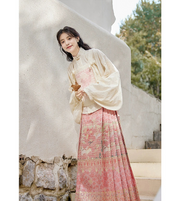For lovers of pastel colors and deers, the Lu Lu 陆陆 Deer Deer Modernized Ming Dynasty Knit Zhuyao & Mamian Skirt Set is a funky take on classic Ming silhouettes.