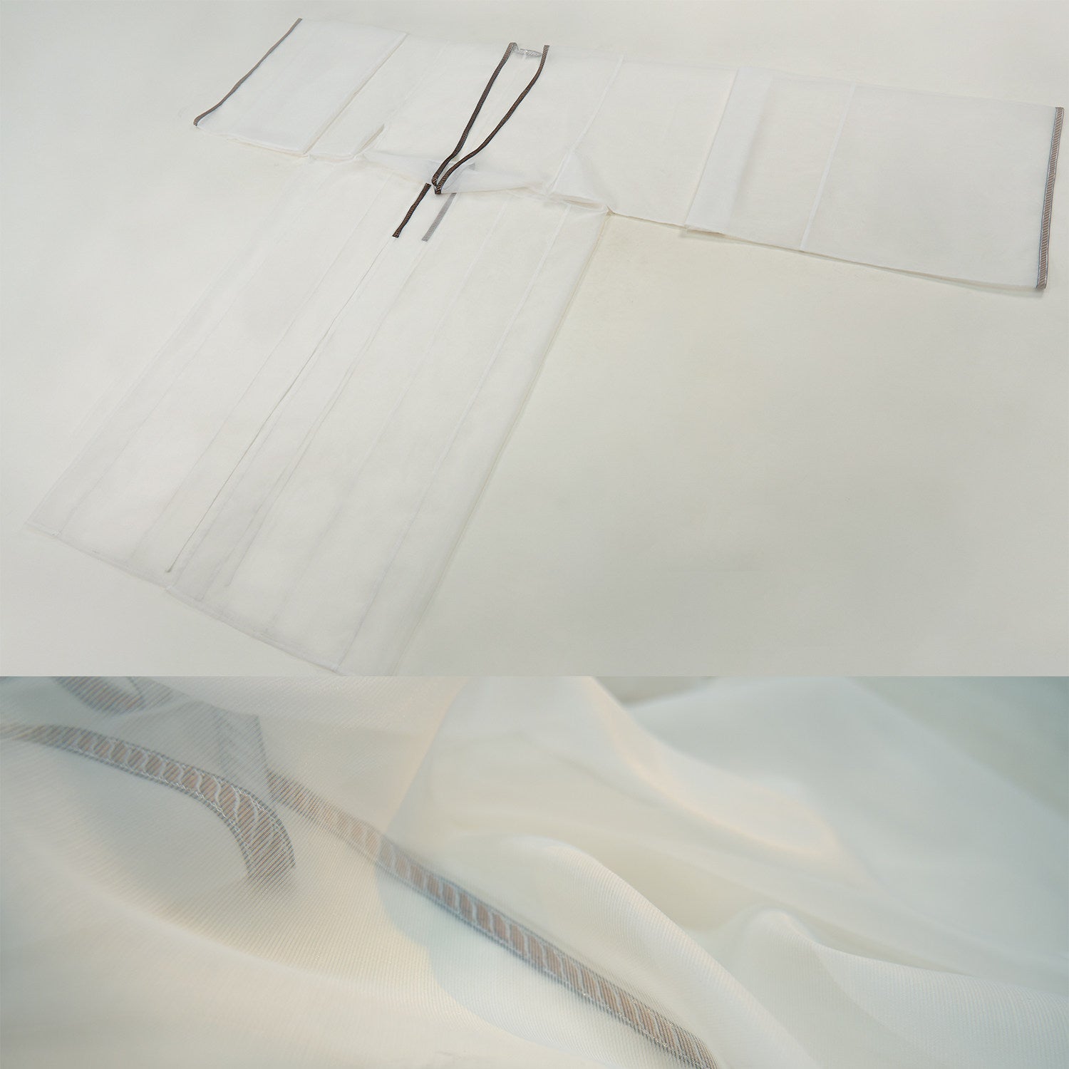 Finally, for extra drama, add the sheer outer Zhiju 直裾 layer. Choose from your color of choice: cloud white or midnight black. These sheer robes were originally made from single-thread silk and were a high status symbol due to the taxing creation methods needed. Feel free to mix & match with your inner robe of choice to add a light or dark veneer that shines in the light!