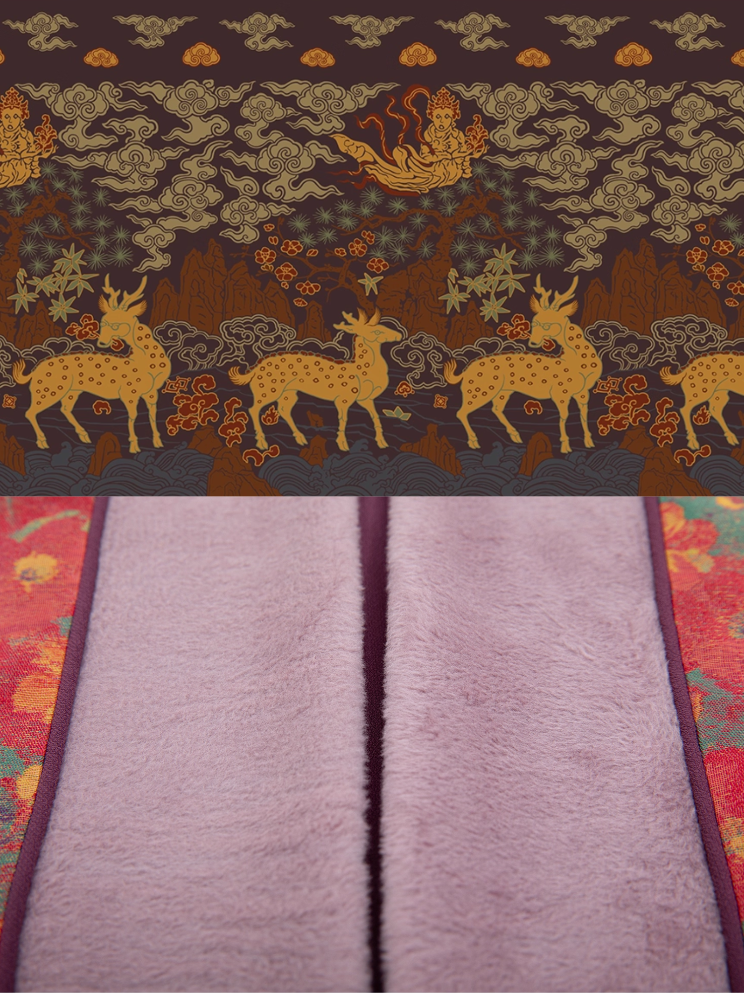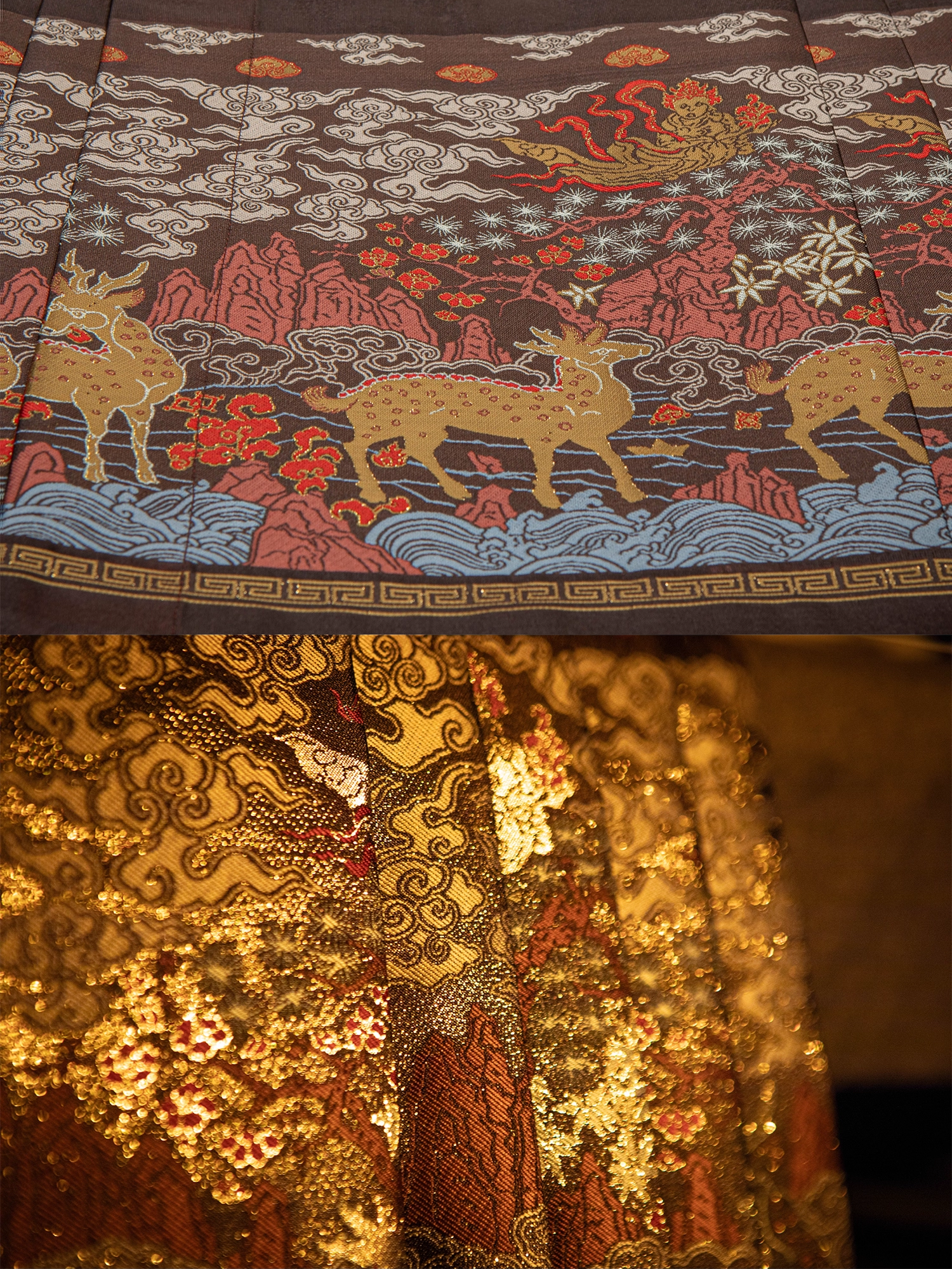 Mamian Qun 马面裙 design is based on actual artifacts found during the Ming Dynasty, symbolizing nature and humanity. Deer, lingzhi mushroom, and flying immortals can be found throughout - these embody the wish for longevity and good health. Pine, bamboo, and plum are historically called the "Three Friends of Winter", they also symbolize the noble and unyielding character of the wearer.