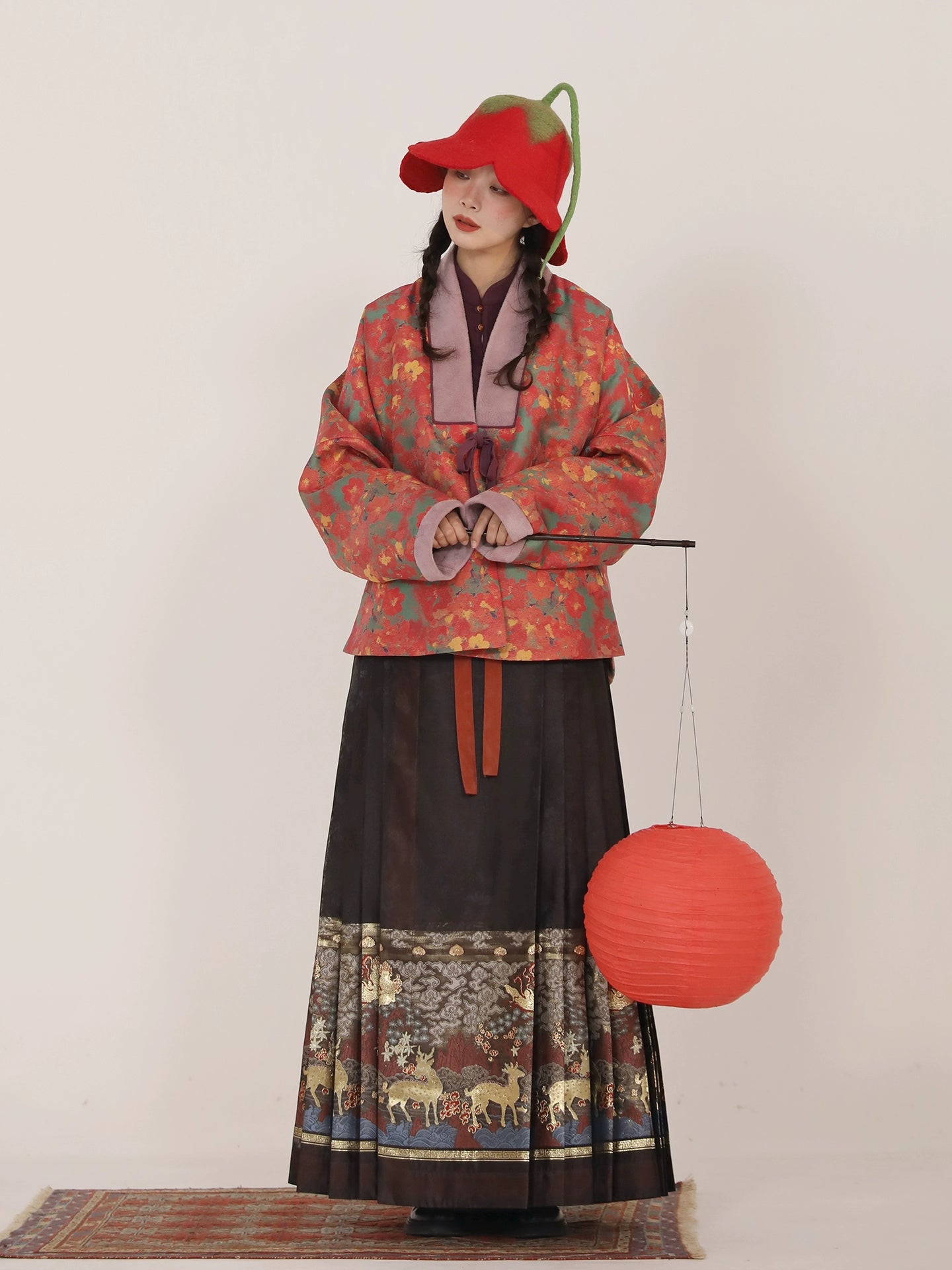 Song Chi 松弛 Relaxed Fit Modernized Ming Dynasty Padded Floral Duijin Ao Winter Coat & Deer Mamian Skirt Set