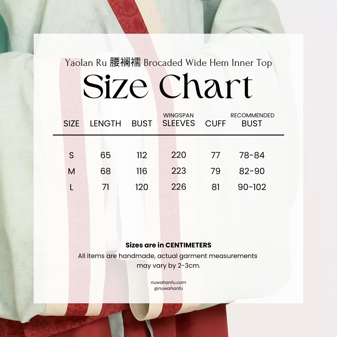 Start with the intricately jacquarded inner Yaolan Ru 腰襕襦, available in celadon green and light yellow, both feature fruit & floral print designs. Contrast trim along the bottom, cuffs, and collar gives it a multilayered look. This design also highlights the Yaolan 腰襕 (wide hem) of these iconic shirts.