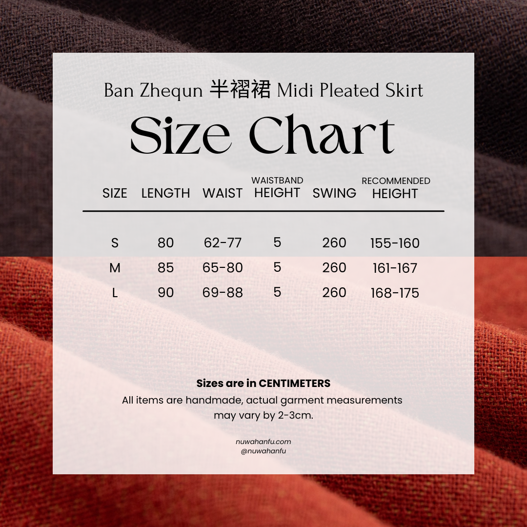 Pair with the matching skirt, based on Zhequn 褶裙 (pleated skirt) from the WeiJin & Tang Dynasties. Features an elastic waistband for easy-wear capabilities, midi length for easy movement throughout the day.