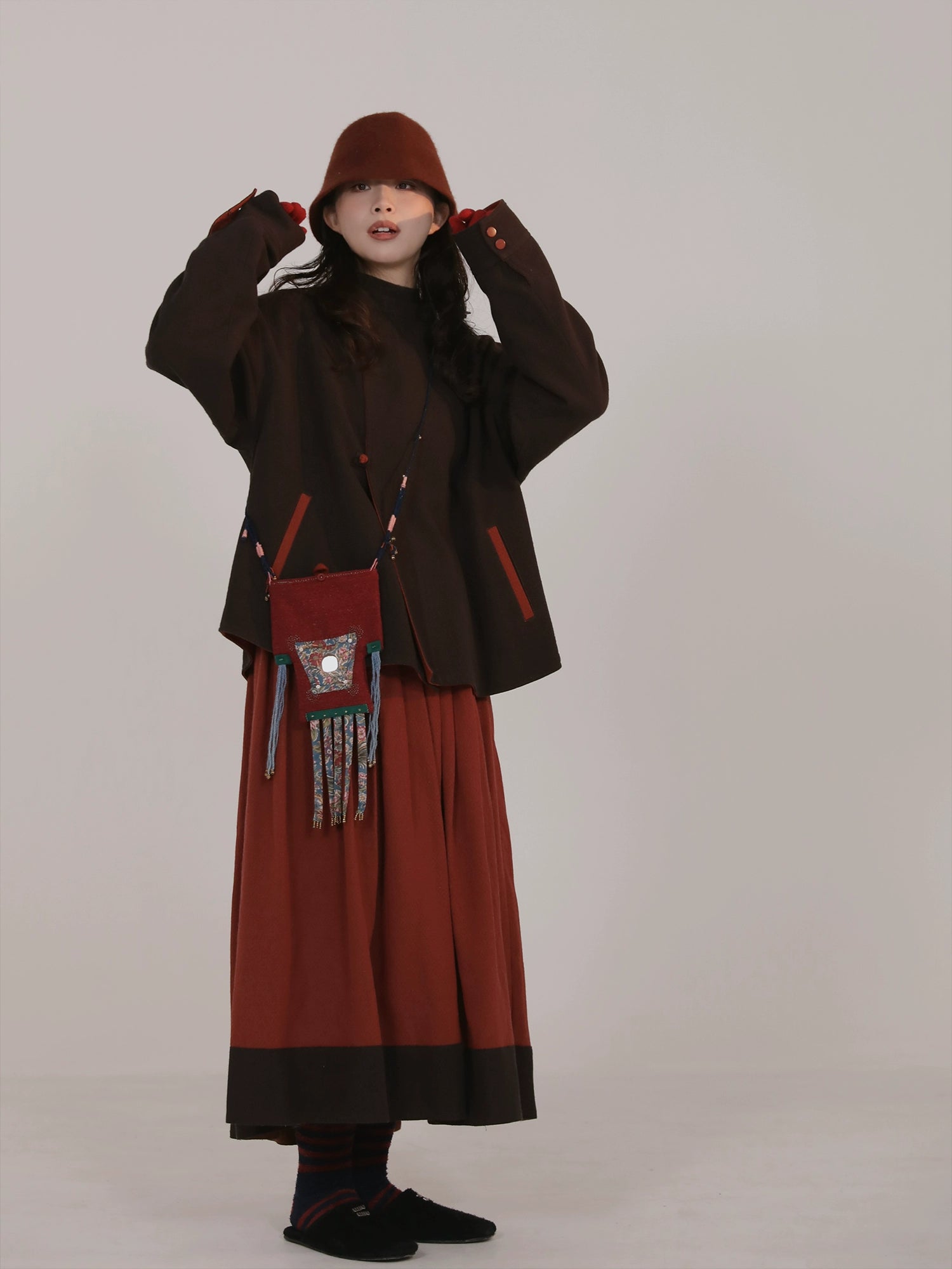 Wumu Hongzhong 乌木红棕 Ebony Red Modernized Tang Double-Sided Cotton Quilt Yuanling Coat & Zhequn Skirt Set