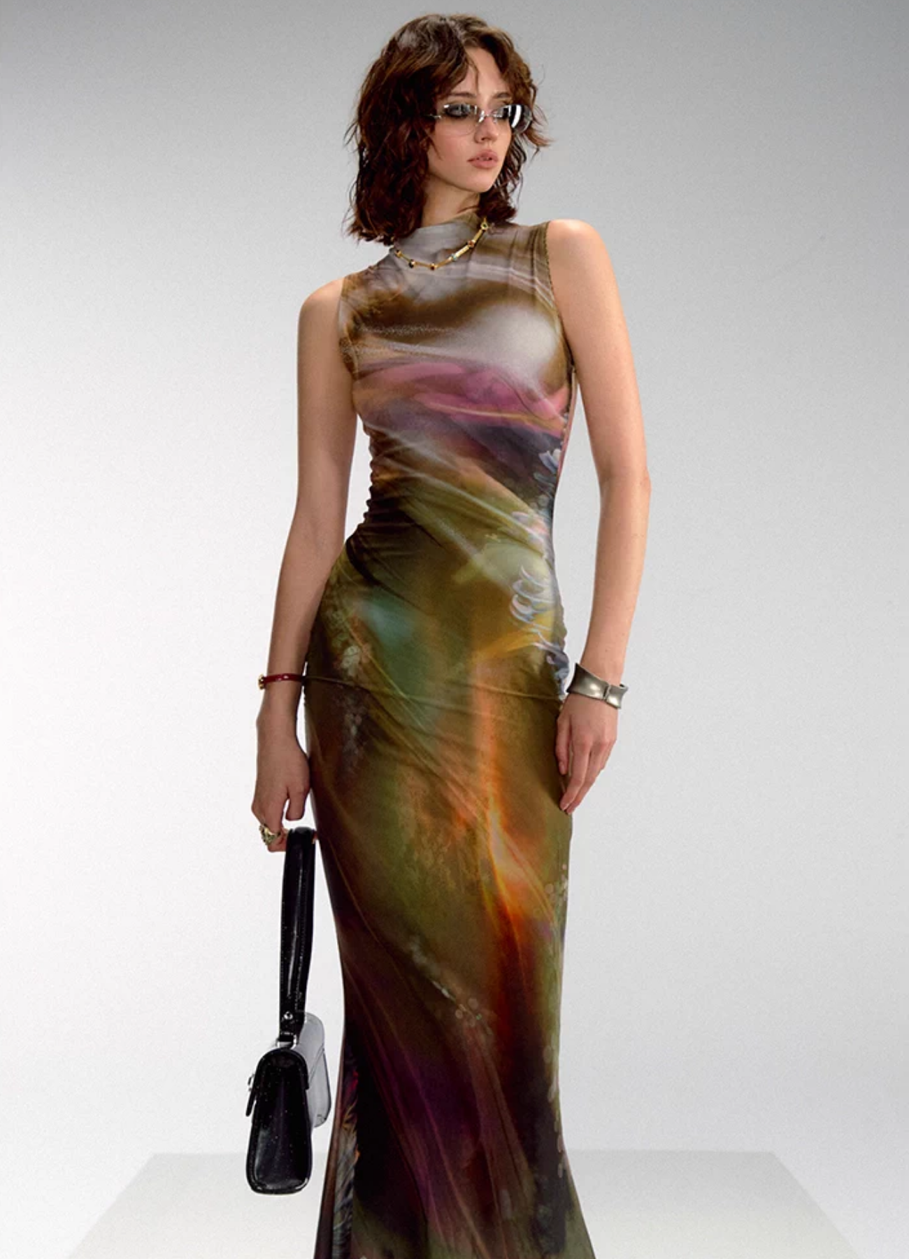 A qipao with enchanting metallic watercolors, reminiscent of freshly glazed pottery.