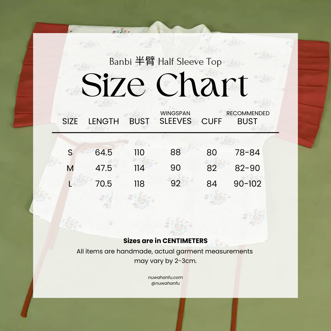 Add the ruffled Banbi 半臂 (half sleeve top) which features tiny dragon print throughout; traditional symbols of royalty, luck, and power. Of course the ruffled hem on the sleeves are the star of the show! Available in white or emerald green, both with crimson red contrast trim.