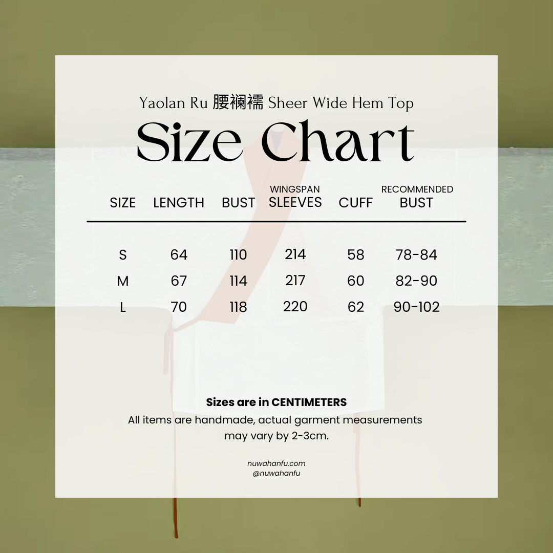 Yaolan 腰襕 are a characteristic wide bottom hem of early dynasty tops. Found commonly from Han to WeiJin style outfits. Style tucked into the skirt or over the skirt for a more comfortable look.