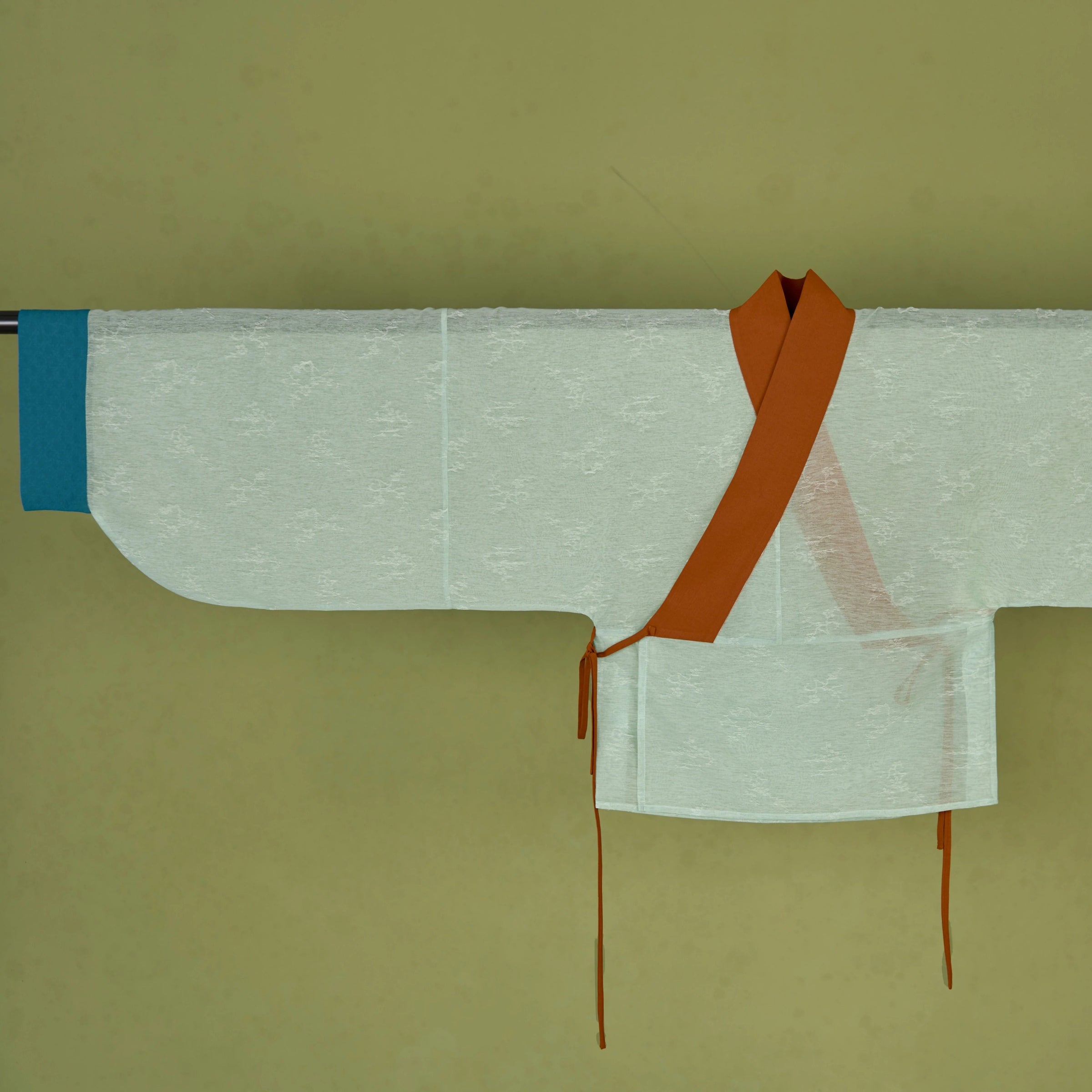 Start with the inner Yaolan Ru 腰襕襦, available in celadon green with little cherry blossom branches jacquarded into the design. Contrast trim along the cuffs and collar add a pop of color when layered with other tops.