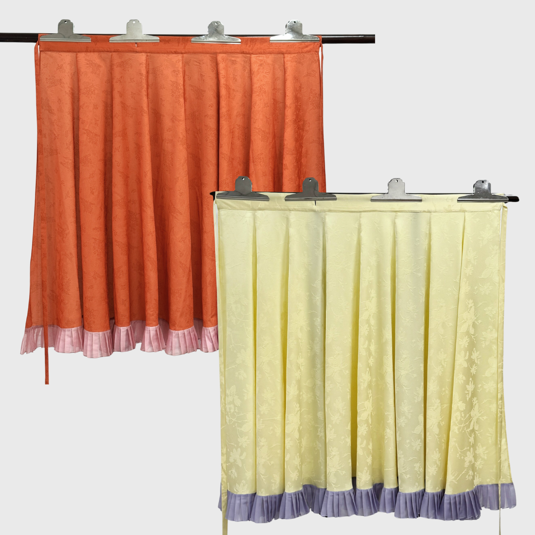Large triangular pieces of jacquard fabric with long ribbons that trail behind. This was a popular component of the Guiyi 袿衣 trend! These decorative aprons also earned the name "Swallow Tail" (Zaju Chuishao Fu 雜裾垂髾服) due to its airy beauty that allowed imperial women to float like heavenly birds. Comes in pastel yellow or scarlet red, both made with jacquard fabric with floral and geometric print.